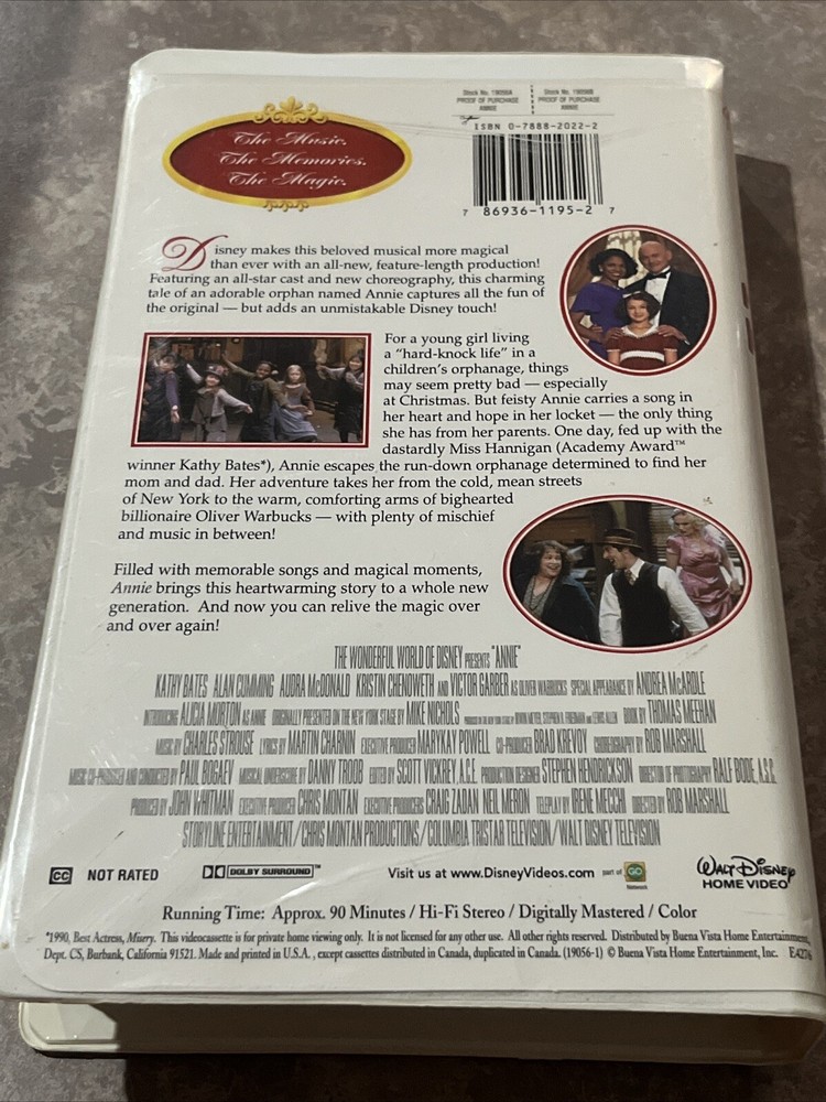 Dive into the heartwarming world of "Annie" with this 2000 VHS edition, a timeless classic that's sure to delight fans of all ages. Featuring a stellar cast including Alan Cumming, Kathy Bates, Victor Garber, and Alicia Morton, this live-action musical brings the story of one of the most beloved orphanages to life, directed by Rob Marshall. Ideal for collectors and enthusiasts of the genre, this VHS tape falls under the Children's & Family category and is presented in NTSC signal standard. "Annie" is not just a movie; it's a celebration of resilience, friendship, and the magic of hope, all captured on tape for your viewing pleasure.