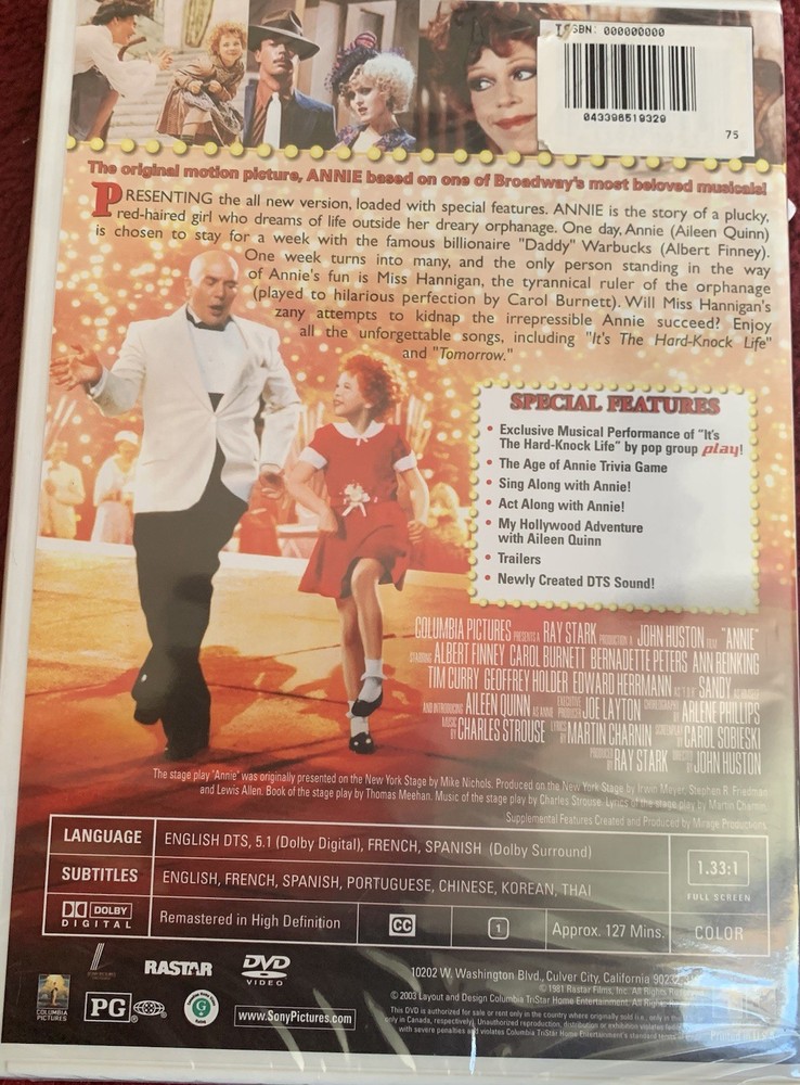 This DVD is a must-have for any Annie fan! The special anniversary edition looks amazing, with crisp picture and sound. Brand new and sealed, it arrived safely and plays perfectly. Such a fun, heartwarming musical—great for family movie night. Fast shipping too! Highly recommend!