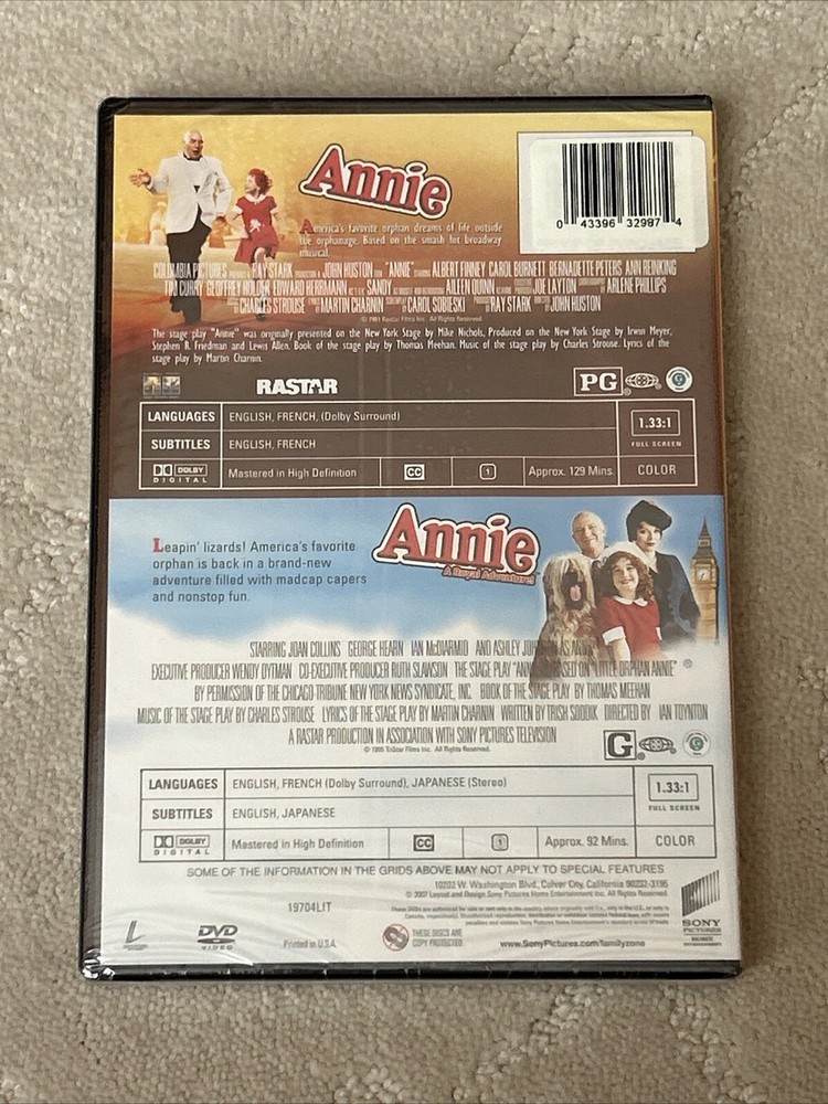 Experience the heartwarming tale of Annie and her royal adventure in this double feature DVD. The film, released in 1982, stars Aileen Quinn, Carol Burnett, Ashley Johnson, and George Hearn, and features a G rating suitable for family viewing. This standard edition DVD comes in a tall/DVD case and has a 1.33 aspect ratio. The DVD is region code 1 (US, Canada...) and is in English language with full screen feature. With a runtime of 219 minutes, this family-live action movie is perfect for any movie lover's collection. Get your hands on this Sony Pictures production and enjoy the classic story of Annie and her journey to find her true family.
