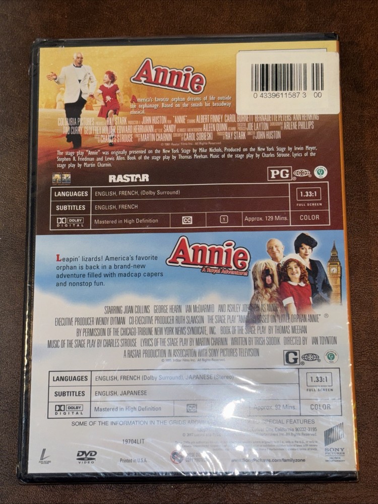 Brand new factory sealed. With light remnants of a sticker being the only signs of ware or damage. Sold as is as pictured. This is a DVD double feature set titled "Annie/Annie:Royal Adventure" released in 2010. It includes two movies featuring actors like Aileen Quinn and Albert Finney. The genre is Musical & Performing Arts, with directors Ian Toynton and John Huston. The region code is DVD: 1 (US, Canada). The format is DVD and it is rated NR.