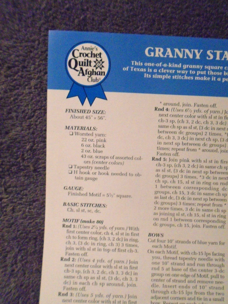 Single page Pattern ANNIES crochet Quilt Afghan club If you buy more than one pattern/leaflet at the same time in the same invoice you will get a discount. Must be paid at the same time. You also pay a single shipping flat rate fee For the Patterns and the leaflets. EACH ADDITIONAL ITEM SHIPS FOR FREE WHEN PAID TOGETHER ON THE SAME INVOICE. ADD ALL ITEMS TO YOUR CART AND WHEN YOU ARE FINISHED SHOPPING, THE DISCOUNT WILL AUTOMATICALLY BE APPLIED WHEN YOU GO TO CHECKOUT. ANY questions please ask. Patterns will be shipped in a page protector. THANK YOU FOR LOOKING BINDER 2