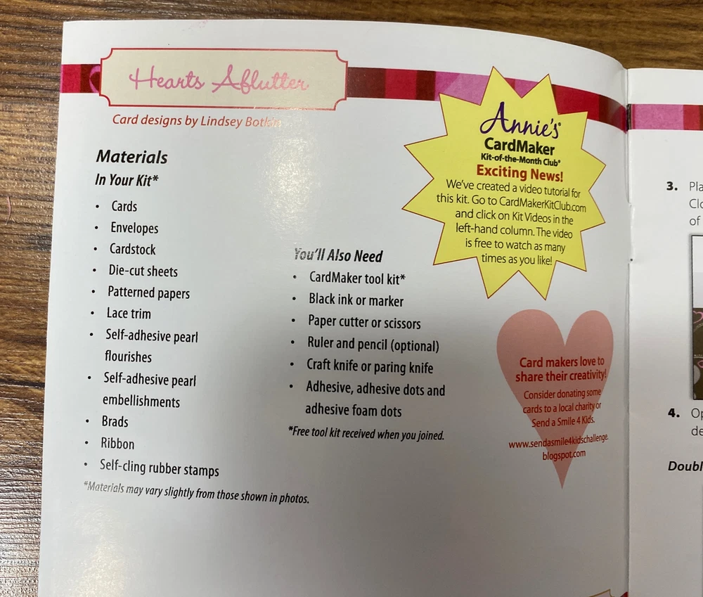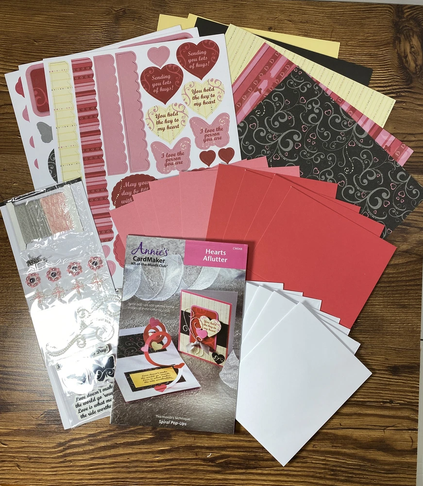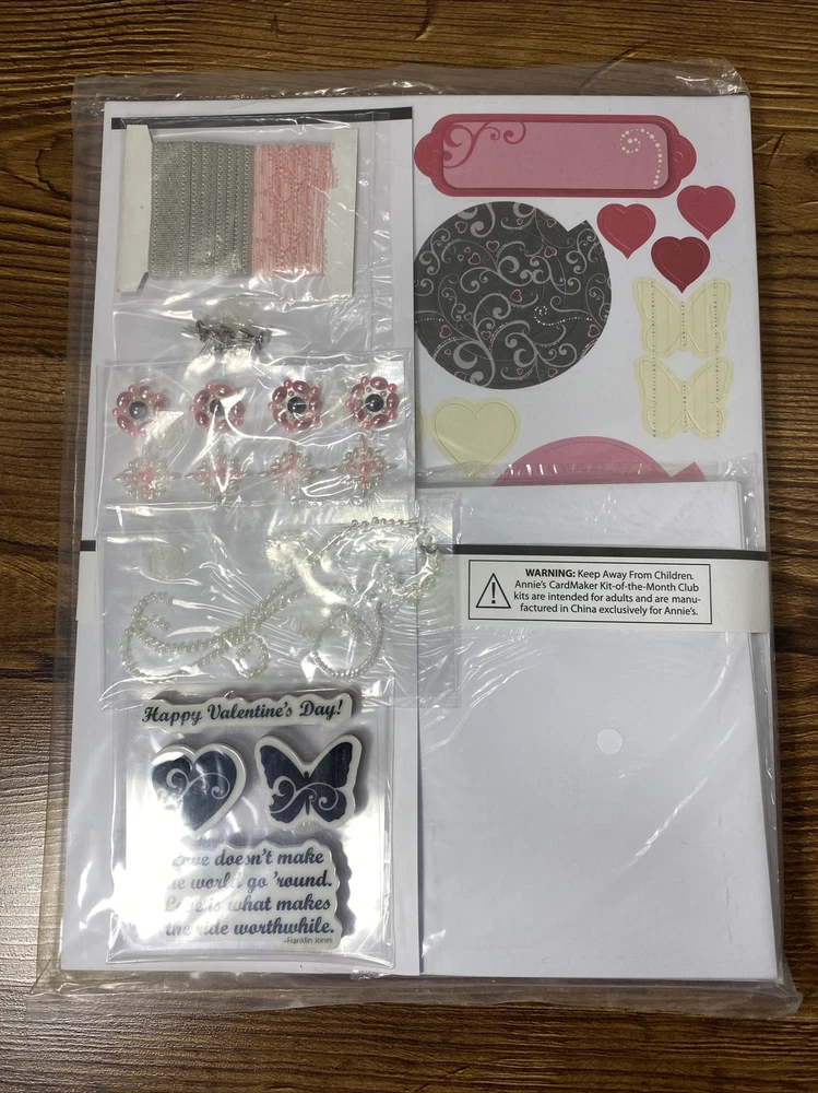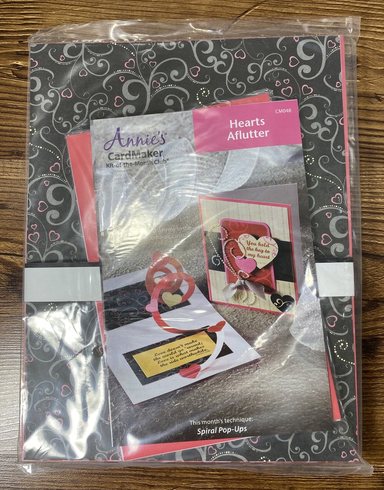 Annie’s CardMaker Kit of the Month "Hearts Aflutter" CM048 Featuring Spiral Pop-Ups Brand New & Factory Sealed Note: Pictures are of my personal opened kit to show you all of the contents. You will receive an UNOPENED factory sealed kit. Contents included in kit: ~Instruction booklet ~8 Cards ~8 Envelopes ~6 - 8 1/2" x 11" Cardstock ~3 - Die-cut Sheets ~Lace Trim ~Self-adhesive pearl flourishes ~Self-adhesive pearl embellishments ~Brads ~Ribbon ~Self Cling Rubber Stamps See pictures for more information as they are part of the description. Great kit to make your own cards to give to your special ones! Also, a great project to do together with others! Ships USPS Priority Mail First item ships at a flat rate of $8.49 Each additional item ships for just an extra $1 per item Only one business day handling time Comes from smoke and pet free home Purchase with confidence 19 years on Ebay 100% positive feedback Please check out my other listings Thank you for your purchase!