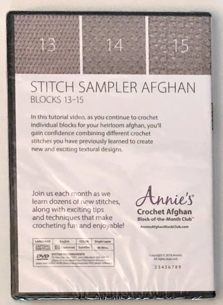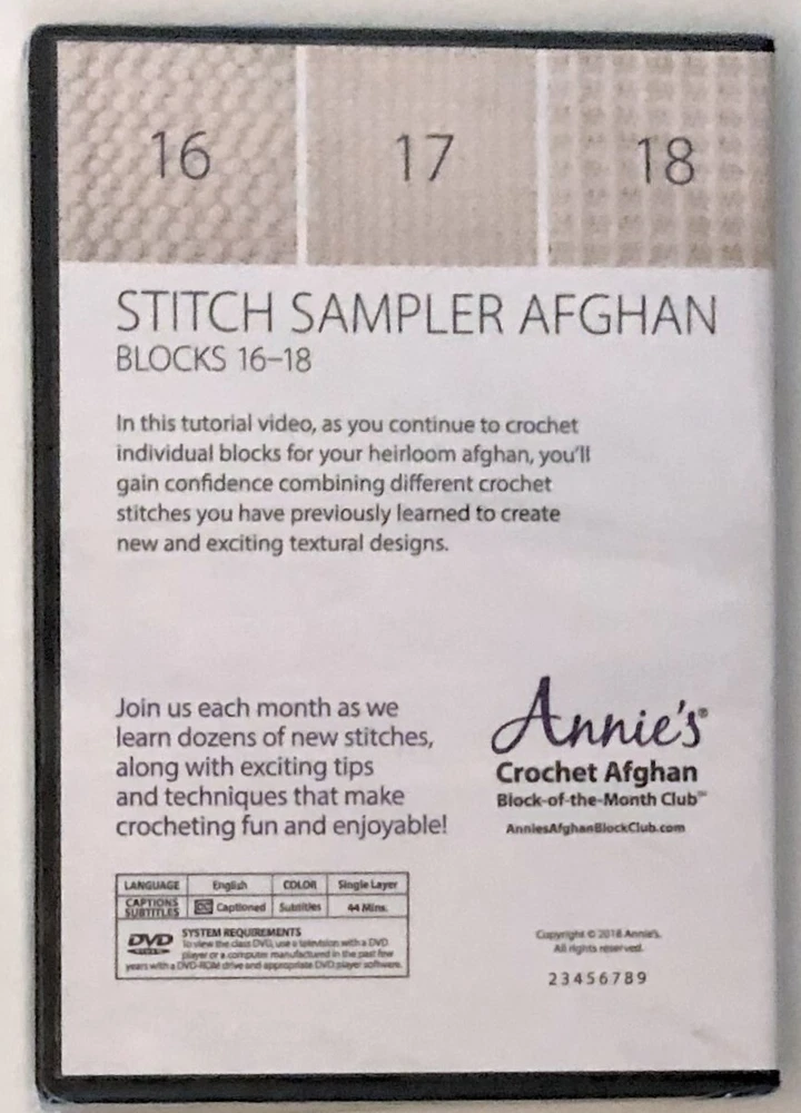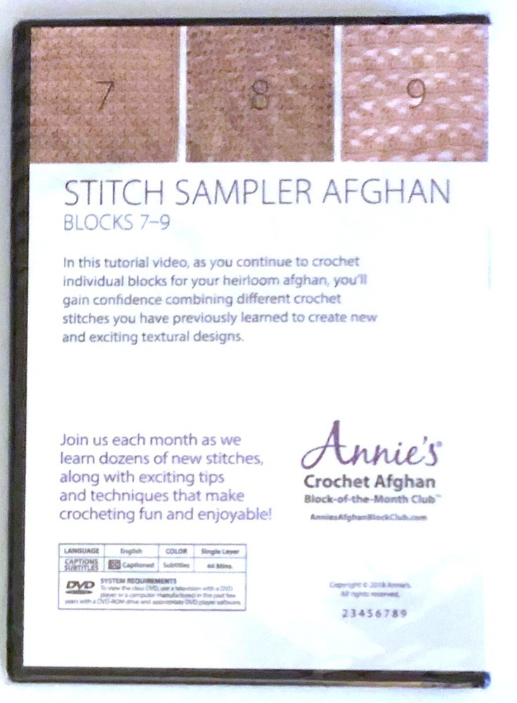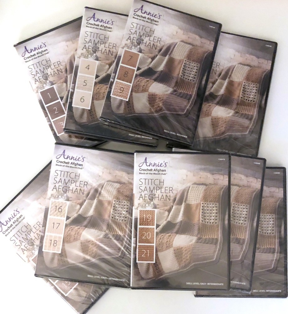 Annie's Crochet Afghan Stitch Sampler Afghan Blocks from the Book-of-The-Month Club, Quilting Sewing How To DVD's. DVD Samplers. Pick one or more DVD's. DVD's are still sealed in original packaging and are in good, clean, condition. I do have more craft Books and DVD's and I offer combined shipping in cart.