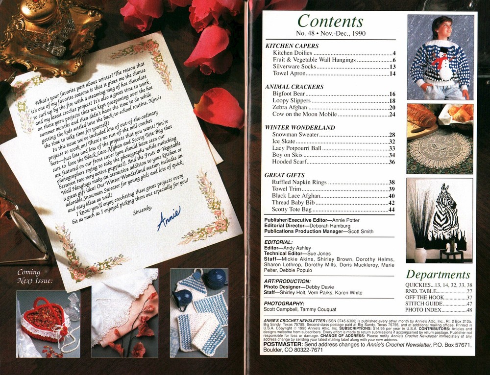 Annie's Crochet Newsletter Magazine | November-December 1990 No. 48. ©1990. 48 pages. Annie's Crochet Newsletter Magazine was a beloved bimonthly publication from 1983 to 1999, offering 46-page, half-size issues packed with exclusive crochet patterns, reader tips, and project inspiration. Each full-color issue featured a charming mix of designs-from cozy afghans, baby wear, and home decor to whimsical toys and doll clothes-paired with clear, reliable instructions trusted by crafters. Popular sections like Rnd. Table, Off the Hook, and Quickies fostered a warm community feel, making the magazine as much about sharing the love of crochet as creating beautiful projects. Today, these vintage issues are highly collectible for their timeless patterns, quality production, and nostalgic charm. Item is Used. This is a USED vintage pattern magazine that is over 30 years old. It is in good condition. Pattern leaflet may smell musty and started to yellow, but all patterns are still readable and usable. Send message prior to buying with any specific questions. Shipping will be via USPS Mail with tracking provided so you can keep track of your purchase as it makes its way to your home. Purple Kitty is located in New York State and must collect sales taxes for items shipped to addresses within New York State. eBay may also collect sales taxes in other states. Check out my other items in my Purple Kitty eBay Store . Buy 2 publications, get 1 free! Combining purchases saves on shipping costs and allows me to pass those savings on to you by offering this quantity discount. Thank you for shopping with Purple Kitty!