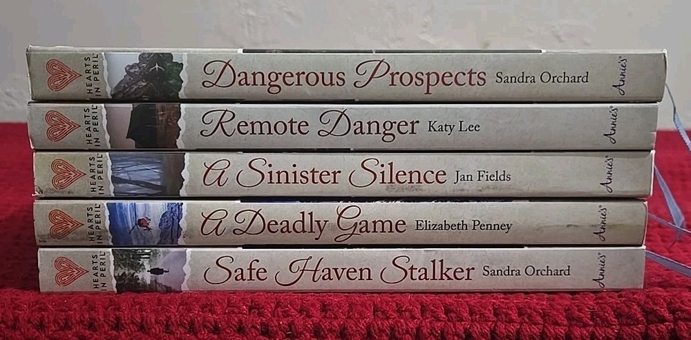 This listing is for 5 Hearts in Peril books. This listing contains: A Deady Game by Elizabeth Penney A Sinister Silence by Jan Fields Remote Danger by Katy Lee Dangerous Prospects by Sandra Orchard Safe Haven Stalker by Sandra Orchard These books are in overall good condition. The dust jackets have wear on the spine. The first pages have a date written in pencil.