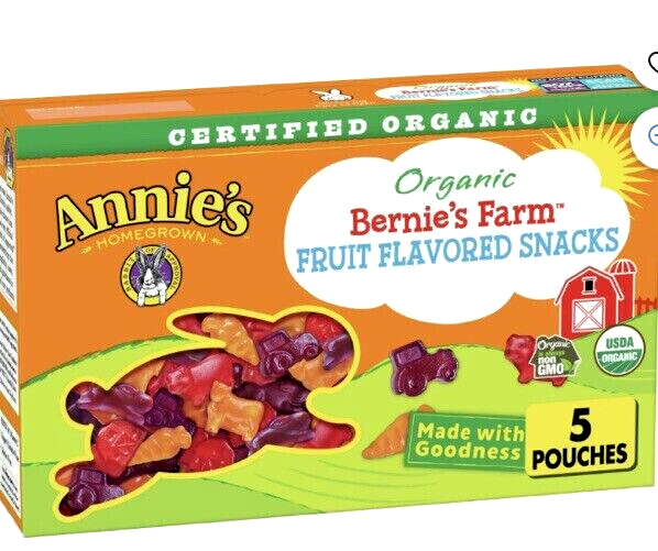Annie's Organic Bernie's Farm Fruit Snacks, 5 Pouches Natural Flavors Non GMO FRUIT-FLAVORED SNACKS: Made with real fruit juice* for bold strawberry, cherry and raspberry flavor WHOLESOME INGREDIENTS: No artificial flavors, synthetic colors or high-fructose corn syrup for added goodness CERTIFIED ORGANIC: Certified organic ingredients VEGAN SNACK: Organic fruit-flavored snacks are vegan, gelatin-free and gluten-free GOOD EATS: Annie's is a purpose-driven brand believing that together, we can leave behind a healthier planet for our kids This listing is for a package of Annie's Organic Bernie's Farm Fruit Snacks. These delicious treats are made with natural flavors and are non-GMO. The snacks come in a bag packaging, and each package contains 5 servings. These fruit snacks are shaped like animals, making them perfect for party occasions. They are ideal for those who are looking for organic food options as they are made with organic ingredients. The expiration date of the product is 12/2024 and it is manufactured in the United States. Personalization is not available for this product.