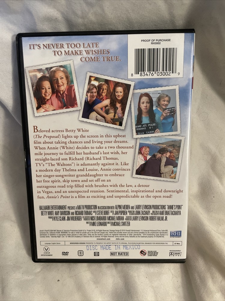 Annie's Point (DVD, 2010) 2005 Movie Betty White Richard Thomas Amy Davidson. Dvd, cover art and case included. Dvd looks good with just a few light scratches. Dvd guaranteed to play like new or returns always welcome. Dvd case looks good also with just some sticker residue on it.