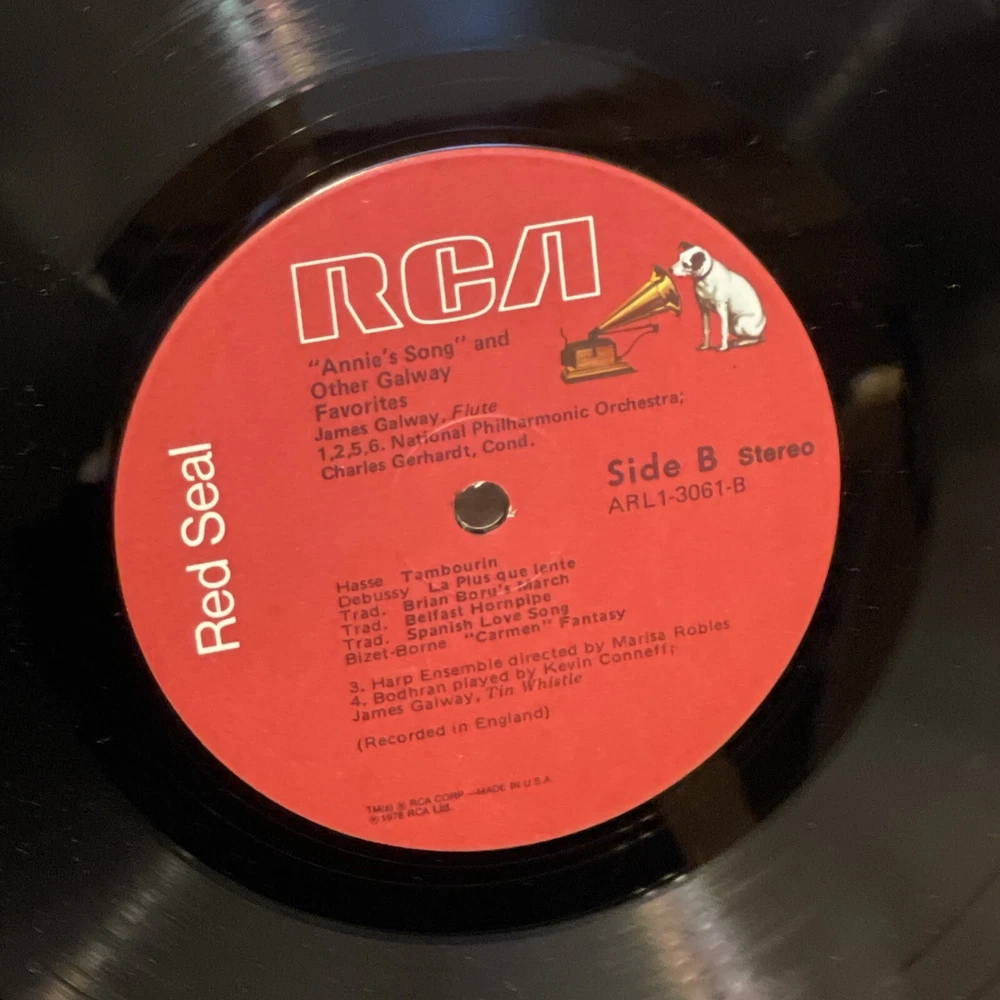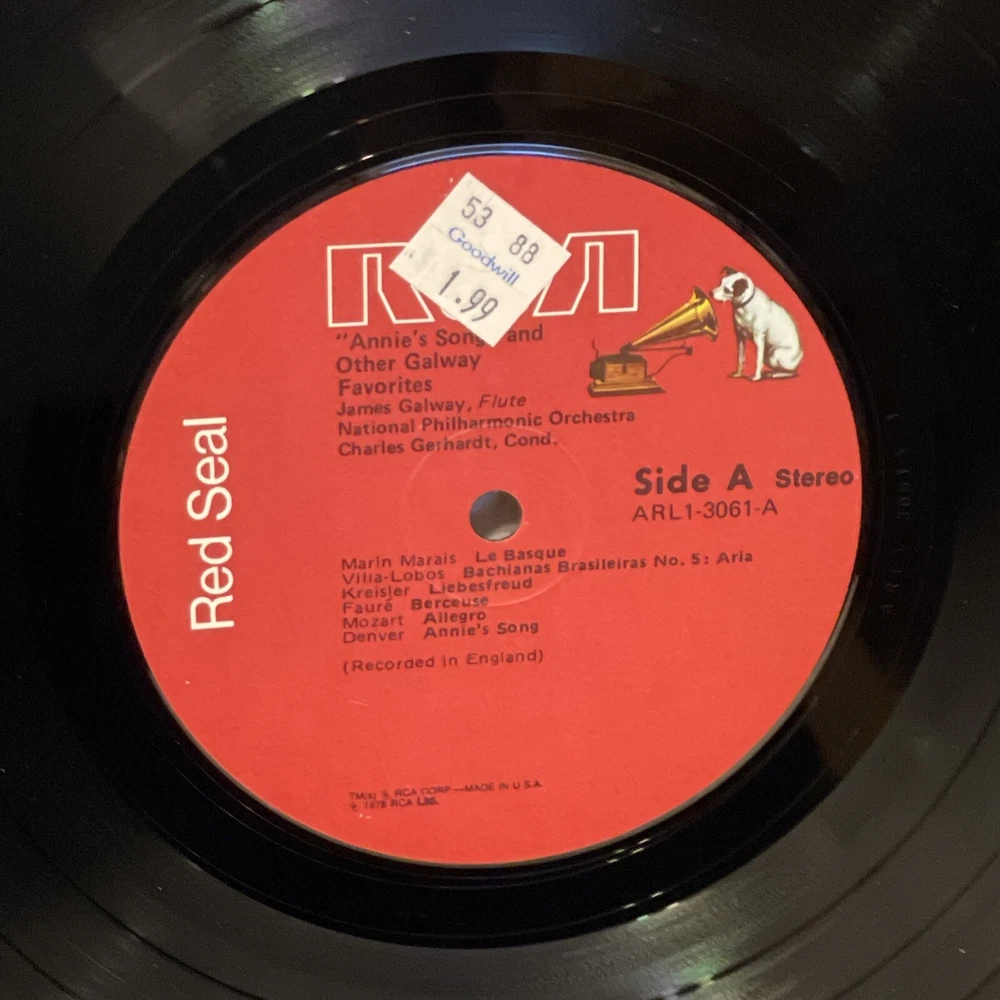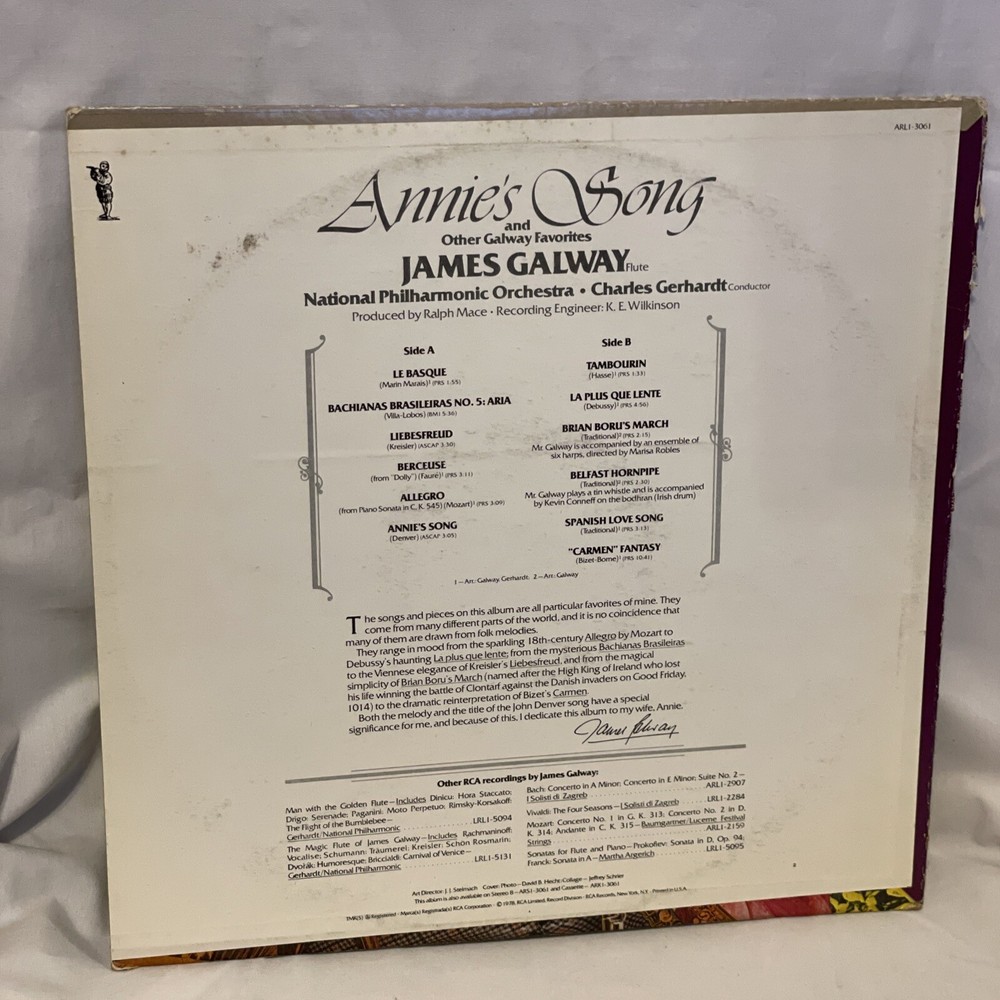 James Galway Charles Gerhardt, National Philharmonic Annie's Song And Other Galway Favorites (Vinyl, 1978) RCA Red Seal ARL1-3061 VG+ . Used with some wear and blemishes see pictures sold as is. Cover has sticker residue, scuffs, edge and ring wear. Record has some light surface scratches and sticker on label. Runouts: Side 1: ARL1-3061A-1 I A1C Side 2: ARL1-3061B-3 I A1C Tracklist: A1 Le Basque 1:55 A2 Bachianas Brasileiras No. 5: Aria 5:36 A3 Liebesfreud 3:30 A4 Berceuse (From "Dolly") 3:11 A5 Allegro (From Piano Sonata In C, K 545) 3:09 A6 Annie's Song 3:05 B1 Tambourin 1:33 B2 La Plus Que Lente 4:56 B3 Brian Boru's March 2:15 B4 Belfast Hornpipe 2:30 B5 Spanish Love Song 3:13 B6 "Carmen" Fantasy 10:41