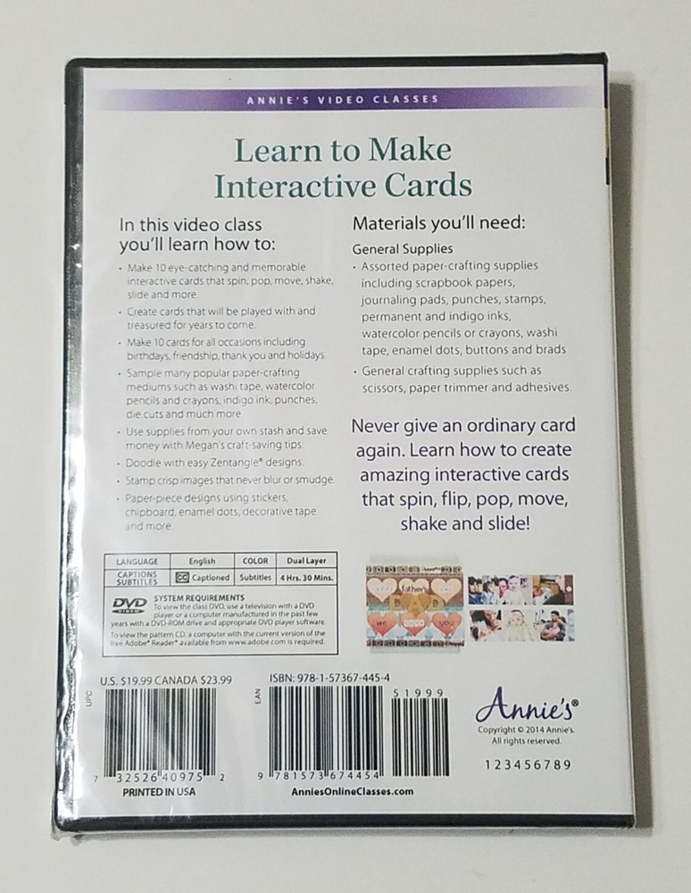 Annie's Video Classes: Learn to Make Interactive Cards DVD DVD Release Year: 2014 ****************** CONDITION and FEATURES : Please look closely at all photos; photos are considered as part of the item description. NEW! SEALED!! RETURNS : *** Please re-read this entire listing, pay special attention to the description and double-check all photos to make sure this is the item you want... we want you to have an informed and successful purchasing experience! If you have any questions about the item, please message us prior to purchase. Thanks! Domestic Returns : BUYER PAYS RETURN SHIPPING. Accepted within 30 days after purchase if the item is returned in it's original condition ( RETURNS ON OPENED, NEW DVDS ARE NOT ACCEPTED) . It must be returned in the same protective packaging that it was sent in. International Returns : Not Accepted. SHIPPING : WE SHIP FROM HAWAI'I! Simply due to the distance and the increased number of post office transfers, shipping is generally a little more expensive and may take an extra day or so to arrive on the US mainland (when compared to items that are shipped from within the US mainland)... season and weather-pending! Shipping costs include: the actual cost of shipping, plus the cost of any applicable materials used for your package such as envelopes, bags, boxes, bubble wrap, protective foam, etc. Domestic Shipping : Your item will ship via USPS First Class mail (if 15 oz. or less) or USPS Priority mail (if 1 lb or more), within one Business Day after eBay has confirmed your payment AND mailing address. Make sure that the mailing address is fully correct; we do not ship to alternative/email-requested addresses . If you have accidentally provided the wrong address, you must cancel your order and re-purchase using the proper mailing address. Combined Domestic Shipping? Usually, we can combine items *depending on what the items are*. If the actual combined shipping cost is less than what you originally paid, we will refund the difference back to you. ************* INTERNATIONAL SHIPPING : We use ONLY eBay's Global Shipping Program (GSP) for International shipping. All requests to ship directly will be declined. BUYER is responsible for all additional International shipping fees, as well as any/all taxes and Customs/Import issues. Please understand that we (the seller) cannot control the cost of international shipping or Customs/Taxes/Import fees, as prices are determined by the US Postal Service, eBay, your local parcel delivery service, and your country's import laws. Multiple-Item Purchases for International Delivery: If you are buying more than one item from our store for International delivery , please message us before purchase with a list of each item that you want. We will create a new listing for you that includes all the items as one combined listing. This will ensure that we can send all the items together in one package, which will help to save on shipping costs. How eBay's GSP works : First, your package will be shipped to eBay's Global Shipping warehouse in Kentucky, USA. Next, your package will be inspected and re-labelled with your international shipping address and tracking number. Expect an extended shipping time frame. We cannot control the extended shipping time, nor any Customs or Import issues. ************* Thanks for looking! The Pineapple Pickers