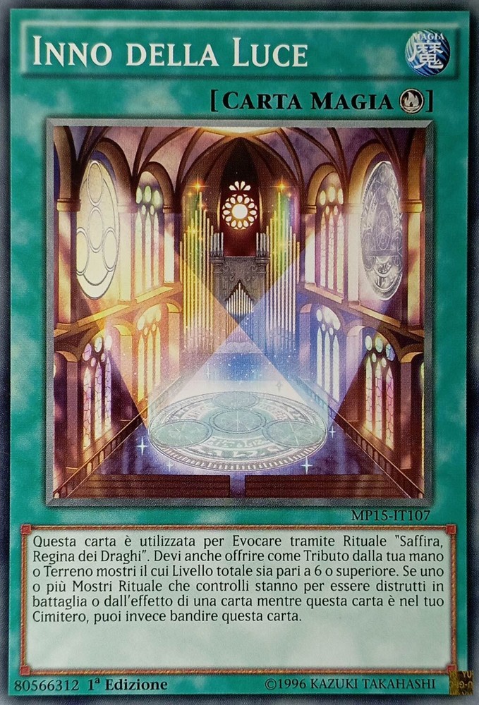 Inno della Luce - Comune - 2015 Mega-Tins Mega-Pack - MP15-IT107 - Ita - Nuovo Inno della Luce - Comune - 2015 Mega-Tins Mega-Pack - MP15-IT107 - Ita - Nuovo Questa carta è utilizzata per Evocare tramite Rituale “Saffira, Regina dei Draghi”. Devi anche offrire come Tributo dalla tua mano o Terreno mostri il cui Livello totale sia pari a 6 o superiore. Se uno o più Mostri Rituale che controlli stanno per essere distrutti in battaglia o dall’effetto di una carta mentre questa carta è nel tuo Cimitero, puoi invece bandire questa carta. Shipping Shipping cost: Italy Posta 1 -> 2,95 Corriere Espresso -> 5,99 Outside Italy Priority - 8,00 Delivery time: La Spedizione Viene Effettuata entro i 5 giorni successivi al pagamento dell'ordine. Payment Per qualsiasi info contattateci Service Per qualsiasi info contattateci