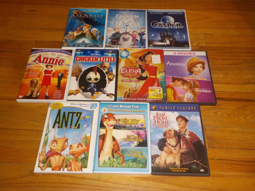 13 CLASSIC FAMILY MOVIES 1. FROZEN - DISC HAS TINY SCRATCHES 2. ANASTASIA/THUMBELINA 2-DISC DOUBLE FEATURE - LIKE NEW 3. ELENA OF AVALOR - DISC HAS A FEW SCRATCHES THAT WONT AFFECT PLAY. INCLULDES SLIPCOVER BOX 4. CASPER - DISC HAS JUST A FEW, LIGHT SCRATCHES 5. ATLANTIS THE LOST EMPIRE - DISC HAS JUST A FEW, LIGHT SCRATCHES 6. ANNIE - LIKE NEW 7. CHICKEN LITTLE - DISC HAS A COUPLE OF LIGHT SCRATCHES 8. ANTZ - DISC HAS A COUPLE OF LIGHT SCRATCHES 9. FAR FROM HOME - LIKE NEW 10. THE LAND BEFORE TIME TRIPLE FEATURE, 2-DISC SET - EACH DISC HAS A COUPLE OF TINY, LIGHT SCRATCHES THE GREAT VALLEY ADVENTURE THE TIME OF THE GREAT GIVING JOURNEY THROUGH THE MISTS