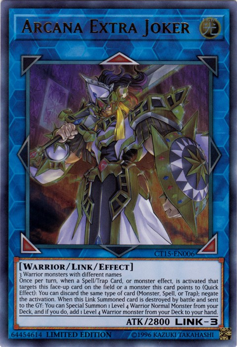 Arcana Extra Joker - CT15-EN006 - Ultra Rare - Limited Edition Image is a stock photo of the card. You will receive the card in Near Mint condition Condition: Near Mint ATK/DEF : 2800/0 Ability : Attack #1 : Attack #2 : Attack #3 : Attribute : Light Card Number : CT15-EN006 Card Rules : Card Text : Materials: 3 Warrior monsters with different names Once per turn, when a Spell/Trap card, or monster effect, is activated that targets this face-up card on the field or a monster this card points to (Quick Effect): You can discard the same type of card (Monster, Spell, or Trap); negate the activation. When this Link Summoned card is destroyed by battle and sent to the GY: You can Special Summon 1 Level 4 Warrior Normal Monster from your Deck, and if you do, add 1 Level 4 Warrior monster from your Deck to your hand. Card Type : EffectLink Monster Edition : Limited Finish : HP : Illustrator : Level : 3 Manufacturer : Monster Type : Warrior Name : Arcana Extra Joker Passcode : Pendulum Scale : Rarity : Ultra Rare Resistance : Retreat Cost : Set : 2018 Mega-Tins Promos Stage : Weakness : Be sure to visit our store for a wide selection of your favorite cards! We are running specials RIGHT NOW!! Shipping Options: ~Ships in a regular white envelope with a stamp for FREE! (THERE IS NO TRACKING INFORMATION AVAILABLE FOR THE ABOVE METHOD. SHIPPING TIME IS 4-10 BUSINESS DAYS) ~Ships in a TRACKEDbubble mailer for $5.99! ~Shipments are handled same or next business day. ~FREE SHIPPING for each additional card, so shop around our store!