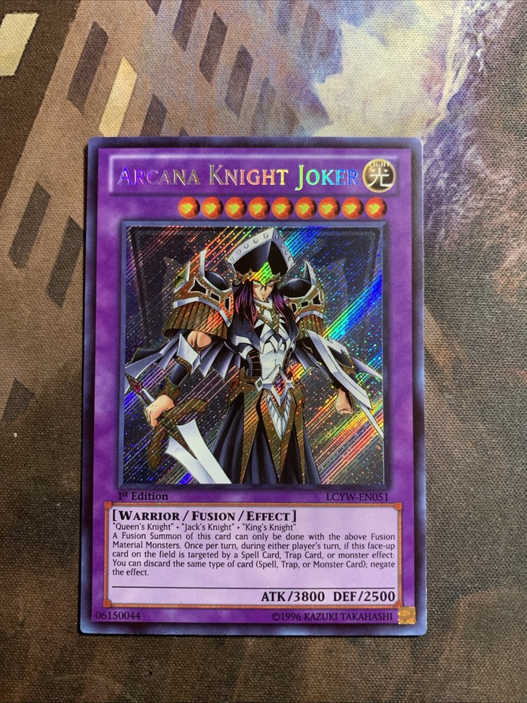 Arcana Knight Joker is a Secret Rare card from the Yu-Gi-Oh! TCG's Legendary Collection 3: Yugi's World set. It is an English 1st Edition Fusion Effect Monster card with 3800 Attack and 2500 Defense, belonging to the Warrior type. The card number is LCYW-EN051 and it is manufactured by Konami.