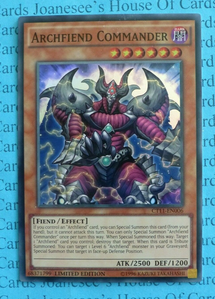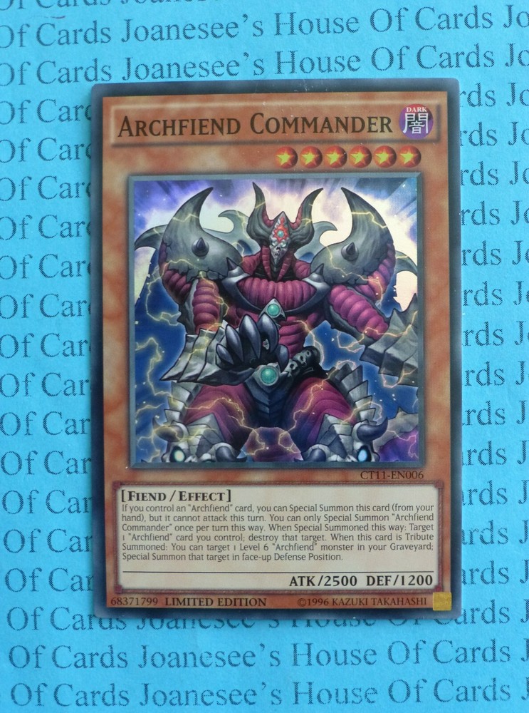 This is a Super Rare Holo Dark Fiend Archfiend Commander 6 Stars ATK/2500 DEF/1200 Card text: If you control an "Archfiend" card, you can Special Summon this card (from your hand), but it cannot attack this turn. You can only Special Summon "Archfiend Commander" once per turn this way. When Special Summoned this way: Target 1 "Archfiend" card you control; destroy that target. When this card is Tribute Summoned: You can target 1 Level 6 "Archfiend" monster in your Graveyard; Special Summon that target in face-up Defense Position. CT11-EN006 Limited Edition English Near MInt Condition Totally Original Konami (or your money back!) I will deliver in safe packaging to keep it in perfect condition. Ideal for players and collectors alike. Check out my other items! I will combine postage costs for multiple purchases. Sign up for my email newsletters by adding my eBay Shop to your favourites