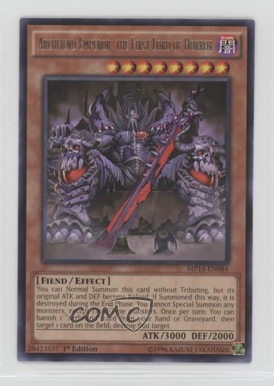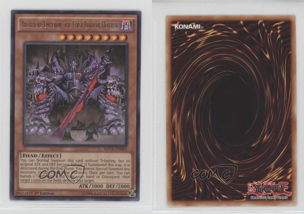 2014 Yu-Gi-Oh! Mega-Tins Mega Pack - [Base] - 1st Edition #MP14-EN084 Archfiend Emperor, the First Lord of Horror COMC Item: 172308230 - YuGiOh Card - Featuring Archfiend Emperor, the First Lord of Horror Search for more: 2014 Yu-Gi-Oh! Mega-Tins Mega Pack Search for more: 2014 Yu-Gi-Oh! Mega-Tins Mega Pack - [Base] - 1st Edition View all of our Listings Auctions Buy It Now About Us Located in the beautiful Pacific Northwest, COMC (Check Out My Cards) is the world's largest consignment service for trading card singles. More than 10,000 people have used our consignment service to list over 50 million trading cards. Find out how we can help you consign your items on eBay by contacting us through eBay messaging. COMC -- "The Safe & Easy Way to Buy & Sell" Raw Condition for Modern Cards Unless otherwise noted, raw modern cards are listed in Near Mint-Mint condition or better. A NM-MT card appears to be Mint at first glance, but upon closer inspection, may exhibit some of the following: minor print defects (e.g. roller marks, print line, dimple), minor scratches, slight edge wear, and slight corner wear. Centering is clearly visible in the images provided and does not factor into our condition assessment. Raw Condition for Vintage Cards Unless otherwise noted, raw vintage cards are listed in Excellent condition or better. An EX card may exhibit some of the following: minor rounding of corners, surface wear, print defects, light scratches, and slight edge wear/chipping. Centering is clearly visible in the images provided and does not factor into our condition assessment. Domestic Shipping Combined shipping for multiple items is available. To receive combined shipping, please ensure all desired items are in your eBay shopping cart before proceeding to checkout. eBay limits orders to 40 items per order. We automatically combine multiple orders placed on the same day. If you place multiple orders on the same day, please contact us to request a refund of applicable shipping costs. Signature confirmation may be required on invoices over $400. All cards are protected and shipped securely. International Shipping COMC offers eBay's International Shipping (EIS) for international orders under $2,500* (see country exceptions below). All duties and import fees are paid at checkout; in the rare event that there are additional import fees upon delivery, these are borne by the buyer. EIS packages route through a shipping hub in Erlanger, KY before shipping to their final destination. Please note that EIS does not allow for combined shipments. The shipping rates are determined by eBay and cannot be adjusted. *Maximum sale price exceptions: Colombia, Kuwait ($2,000); Taiwan ($1,539); Chile, Costa Rica, Guatemala, Honduras, Trinidad and Tobago ($1,000); Antigua and Barbuda, Aruba, Belize, Dominica, Grenada, Philippines, Saint Kitts and Nevis, Saint Lucia, Montserrat, Turks and Caicos Islands ($500); Dominican Republic, El Salvador ($200). Please request a shipping quote through eBay messaging for orders that exceed the maximum sale price supported by eBay's International Shipping. You will be responsible for all duties and import fees for international orders shipped outside the EIS. All cards are protected and shipped securely. Payment COMC does not accept offers on our cards through our eBay storefront. COMC utilizes eBay’s managed payments system. If you are experiencing difficulties making a payment, please contact eBay for assistance. Return Policy Returns are only accepted on the rare occasion the item is not as described. If you are making a return, please initiate the return process through eBay so a mailing label can be provided for you. Prior to listing, our expert team carefully assessed this item to represent it accurately. Please review the description and high-definition images prior to purchasing to ensure this item meets your satisfaction. We welcome you to contact us if you have further questions about this item. Trust and Integrity COMC carefully assesses each item consigned to us to prevent fraudulent items from entering the marketplace. If you believe an item offered on COMC may be fraudulent, please contact us with details so we can investigate the issue. Items we determine are outside our supported items policy may be removed. Last Modified: 6/3/2025 5:04:18 AM PDT