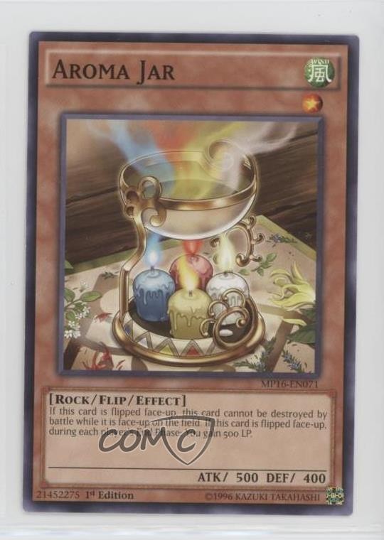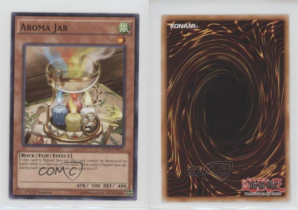 2016 Yu-Gi-Oh! Mega-Tin - Mega Pack [Base] - 1st Edition #MP16-EN071 Aroma Jar COMC Item: 109199747 - YuGiOh Card - Featuring Aroma Jar Search for more: 2016 Yu-Gi-Oh! Mega-Tin Search for more: 2016 Yu-Gi-Oh! Mega-Tin - Mega Pack [Base] - 1st Edition View all of our Listings Auctions Buy It Now About Us Located in the beautiful Pacific Northwest, COMC (Check Out My Cards) is the world's largest consignment service for trading card singles. More than 10,000 people have used our consignment service to list over 50 million trading cards. Find out how we can help you consign your items on eBay by contacting us through eBay messaging. COMC -- "The Safe & Easy Way to Buy & Sell" Raw Condition for Modern Cards Unless otherwise noted, raw modern cards are listed in Near Mint-Mint condition or better. A NM-MT card appears to be Mint at first glance, but upon closer inspection, may exhibit some of the following: minor print defects (e.g. roller marks, print line, dimple), minor scratches, slight edge wear, and slight corner wear. Centering is clearly visible in the images provided and does not factor into our condition assessment. Raw Condition for Vintage Cards Unless otherwise noted, raw vintage cards are listed in Excellent condition or better. An EX card may exhibit some of the following: minor rounding of corners, surface wear, print defects, light scratches, and slight edge wear/chipping. Centering is clearly visible in the images provided and does not factor into our condition assessment. Domestic Shipping Combined shipping for multiple items is available. To receive combined shipping, please ensure all desired items are in your eBay shopping cart before proceeding to checkout. eBay limits orders to 40 items per order. We automatically combine multiple orders placed on the same day. If you place multiple orders on the same day, please contact us to request a refund of applicable shipping costs. Signature confirmation may be required on invoices over $400. All cards are protected and shipped securely. International Shipping COMC offers eBay's International Shipping (EIS) for international orders under $2,500* (see country exceptions below). All duties and import fees are paid at checkout; in the rare event that there are additional import fees upon delivery, these are borne by the buyer. EIS packages route through a shipping hub in Erlanger, KY before shipping to their final destination. Please note that EIS does not allow for combined shipments. The shipping rates are determined by eBay and cannot be adjusted. *Maximum sale price exceptions: Colombia, Kuwait ($2,000); Taiwan ($1,539); Chile, Costa Rica, Guatemala, Honduras, Trinidad and Tobago ($1,000); Antigua and Barbuda, Aruba, Belize, Dominica, Grenada, Philippines, Saint Kitts and Nevis, Saint Lucia, Montserrat, Turks and Caicos Islands ($500); Dominican Republic, El Salvador ($200). Please request a shipping quote through eBay messaging for orders that exceed the maximum sale price supported by eBay's International Shipping. You will be responsible for all duties and import fees for international orders shipped outside the EIS. All cards are protected and shipped securely. Payment COMC does not accept offers on our cards through our eBay storefront. COMC utilizes eBay’s managed payments system. If you are experiencing difficulties making a payment, please contact eBay for assistance. Return Policy Returns are only accepted on the rare occasion the item is not as described. If you are making a return, please initiate the return process through eBay so a mailing label can be provided for you. Prior to listing, our expert team carefully assessed this item to represent it accurately. Please review the description and high-definition images prior to purchasing to ensure this item meets your satisfaction. We welcome you to contact us if you have further questions about this item. Trust and Integrity COMC carefully assesses each item consigned to us to prevent fraudulent items from entering the marketplace. If you believe an item offered on COMC may be fraudulent, please contact us with details so we can investigate the issue. Items we determine are outside our supported items policy may be removed. Last Modified: 6/2/2025 6:03:16 PM PDT