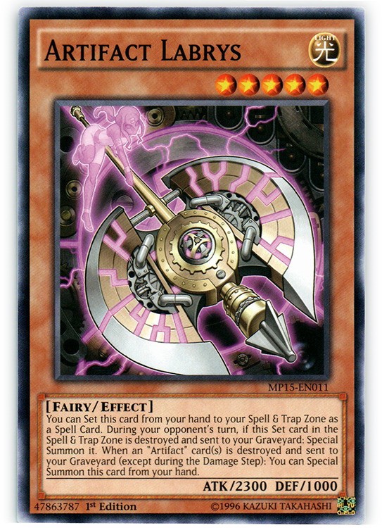 Artifact Labrys - MP15-EN011 - Common - 1st Edition Image is a stock photo of the card. You will receive the card in Moderately Played condition Condition: Moderately Played ATK/DEF : 2300/1000 Ability : Attack #1 : Attack #2 : Attack #3 : Attribute : Light Card Number : MP15-EN011 Card Rules : Card Text : You can Set this card from your hand to your Spell & Trap Card Zone as a Spell Card. During your opponent's turn, when this Set card in your Spell & Trap Card Zone is destroyed and sent to your Graveyard: Special Summon it. When an "Artifact" card(s) is destroyed and sent to your Graveyard (except during the Damage Step): You can Special Summon this card from your hand. Card Type : Effect Monster Edition : 1st Finish : HP : Illustrator : Level : 5 Manufacturer : Monster Type : Fairy Name : Artifact Labrys Passcode : 47863787 Pendulum Scale : Rarity : Common Resistance : Retreat Cost : Set : 2018 Mega Tin Pack Stage : Weakness : Be sure to visit our store for a wide selection of your favorite cards! We are running specials RIGHT NOW!! Shipping Options: ~Ships in a regular white envelope with a stamp for FREE! (THERE IS NO TRACKING INFORMATION AVAILABLE FOR THE ABOVE METHOD. SHIPPING TIME IS 4-10 BUSINESS DAYS) ~Ships in a TRACKEDbubble mailer for $5.99! ~Shipments are handled same or next business day. ~FREE SHIPPING for each additional card, so shop around our store!