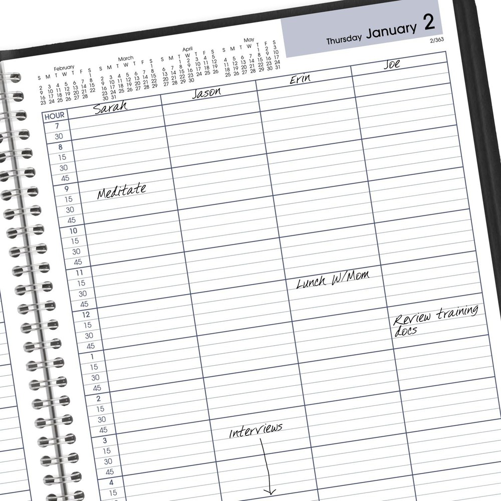 YEAR ROUND PLANNING – Planner covers a 12-month date range from January 2025 — December 2025 with Julian dates GUARANTEED TO LAST ALL YEAR – ACCO Brands will replace any defective planner that is returned within one year from the date of purchase. This guarantee does not cover damage due to misuse or abuse. INK BLEED RESISTANCE – Plan your schedule without fear of distracting ink bleeding. Our high-quality paper is designed for ink bleed resistance, which keeps plans neat and legible. 4-PERSON PLANNING – 1 day per page spread has 4 ruled columns for side-by-side planning. Perfect for offices or busy families. Quarter-hourly appointment times run 7:00 a.m. — 8:00 p.m. on weekdays and 7:00 a.m. — 6:00 p.m. on Saturday. ENHANCED ORGANIZATION – Includes a 3-year reference calendar, future planning and phone number pages PROFESSIONAL DESIGN – Planner has a durable black cover and twin wire binding to help prevent snags and secure pages ASSEMBLED IN THE U.S. – Thoughtfully designed and assembled in the U.S. using high-quality materials