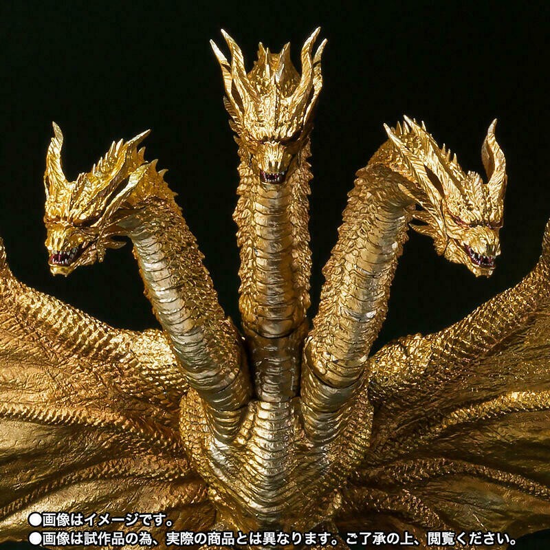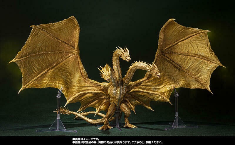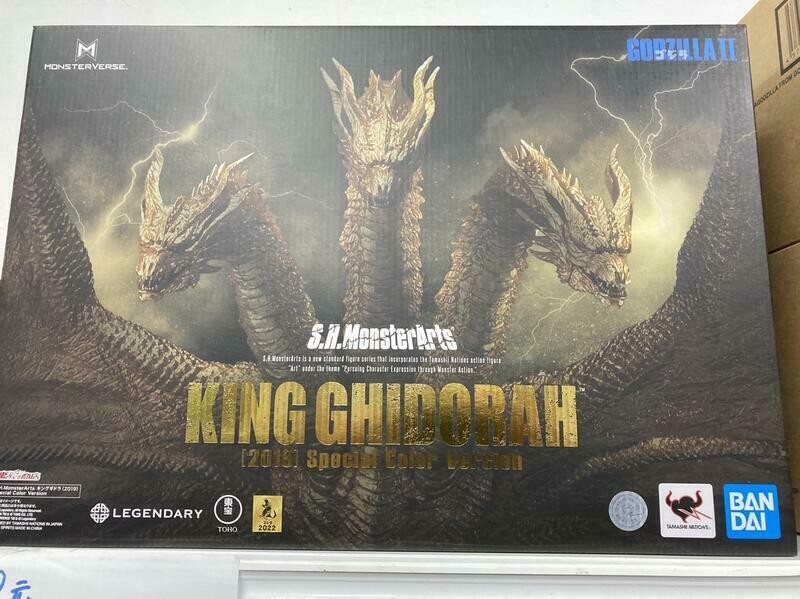 AVAILABLE IN STORE AND READY TO SHIP WORLDWIDE !! IN BROWN BOX BANDAI TAMASHII FACTORY SEALED! The fearsome King Ghidorah, as seen in the 2019 film Godzilla: King of the Monsters joins the SHMonsterArts series! It's sculpted and finished with all of the care you've come to expect from Bandai, featuring effect parts that let you replicate dramatic scenes from the film. Based on the same 3D data used in the film, and overseen by the legendary sculptor Shinichi Wakasa, it features accurate proportions, details, and coloration. This release features a new metallic gold color scheme. Product Features 9.84 inches (25cm) height 23.60 inches (60cm) wingspan Made of plastic From Godzilla: King of the Monsters Sculpted by Wakasa Shinichi Boasts an innovative jointing system Special color version Box Contents King Ghidorah figure Stage set