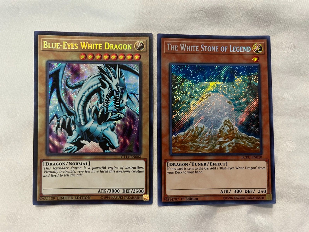 BLUE-EYES WHITE DRAGON SECRET CT14-EN002 LEGENDARY COLLECTION KAIBA WHITE STONE AS SHOWN IN PICTURES: ALL CARDS ARE IN NEAR MINT OR VERY LIGHTLY PLAYED CONDITION! GREAT CONDITION! BLUE-EYES WHITE DRAGON LCKC-EN001 (ULTRA RARE) THE WHITE STONE OF ANCEINTS (SECRET RARE) ALL orders from my store will be shipped in a small envelope WITH tracking shipped with an eBay standard envelope tracking label. See shipping price! Handling time is 2 days, and then the item will be shipped immediately!