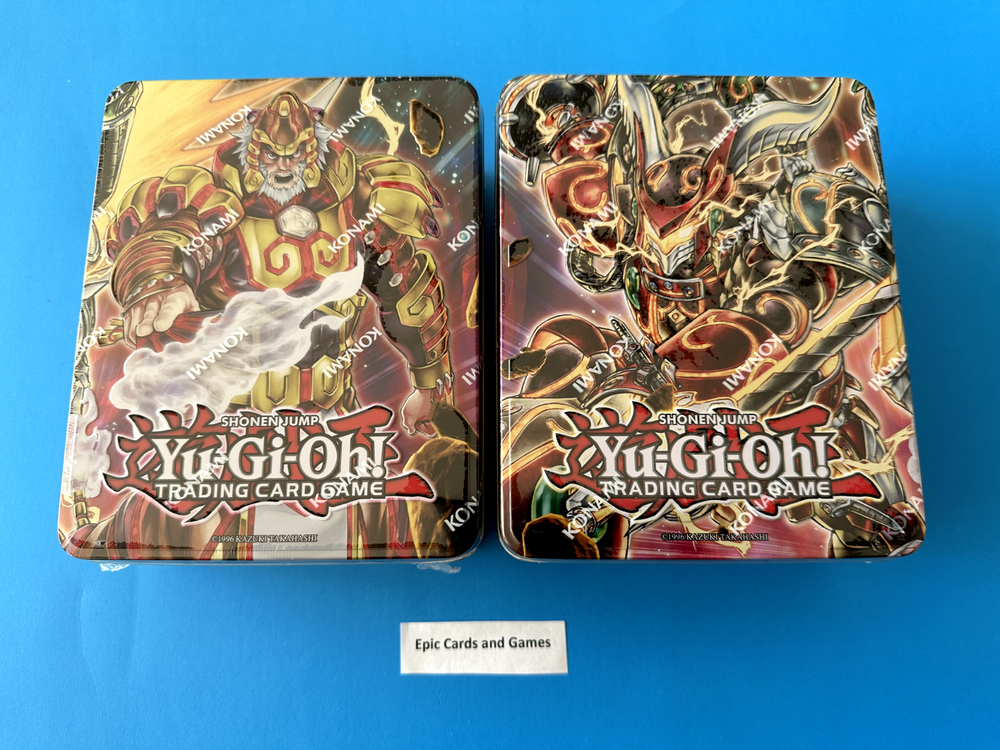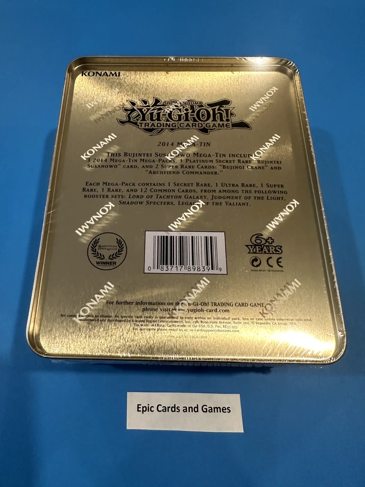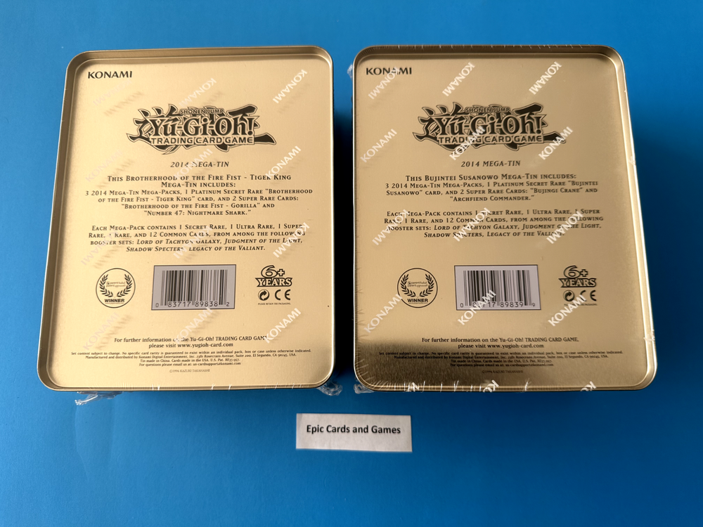 You are bidding o n : 1 x Yu-Gi-Oh 2014 Mega Tin Set Include Both Tins BROTHERHOOD OF THE FIRE FIST - TIGER KING & BUJINTEI SUSANOWO Mega Tins Each Mega Tin come with the following: Each Mega-Tin will include three (3x) 16-card Mega- Packs with cards taken from past releases: 12 Common cards, 1 Rare card, 1 Super Rare card, 1 Ultra Rare card, and 1 Secret Rare card. 1 Platinum Secret Rare " Brotherhood of the Fire Fist - Tiger King " and 2 Super Rare Cards : Brotherhood of the Fire Fist - Gorilla and Number 47 : Nightmare Shark. " 1 Platinum Secret Rare " BUJINTEI SUSANOWO " and 2 Super Rare Cards : Bujintei Crane and Archfiend Commander. " Please check pictures for more detail. Condition: Brand new and unopened . Please see pictures for condition. Will hand pick you from Sealed Case Payment is due within 5 days of the end of this auction. (If we don't have an item in stock due to inventory problems etc, we will refund your payment immediately, please understand these things happen and we try our best to make sure they don’t but mistakes can happen.) Shipping : Handling time: 1 - 3 days *“Business days” are normal weekdays. Saturdays, Sundays, and major holidays do not count as business days. Expedited within Canada & USA ( S hipping is calculated based on your location. ) Epic Cards and Games Any questions feel free to email us and allow 1 day for a response. Thanks for looking! Sales Tax (Canada Only) : Purchases made by Canadian residents are subject to applicable GST/HST, depending on your province/territory. (If you do not agree to this, please do not bid. We have a registered business in Canada and are required by law to charge taxes to anything shipped within the country.) Thank you for shopping with Epic Cards and Games (Box 34x27x12 cm)