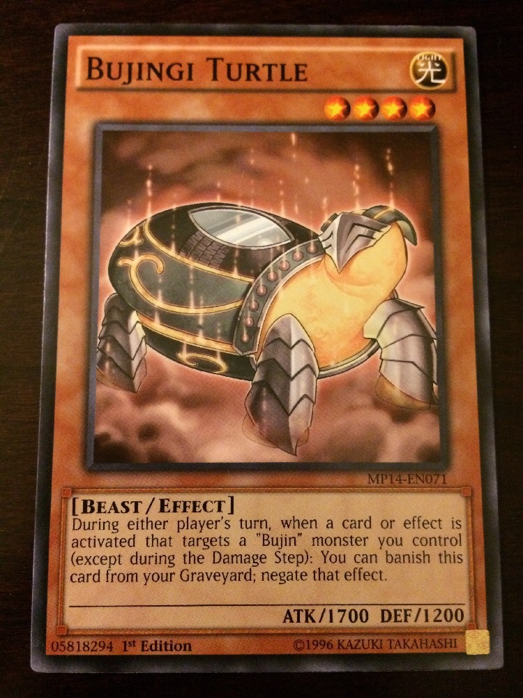 Absolutely thrilled with this BUJINGI TURTLE card—it arrived in perfect Near Mint condition, just as described! The seller went above and beyond with the packaging, using a plastic sleeve and sturdy chipboard for protection. Super fast shipping too! Highly recommend adding the top loader for extra security. A must-have for any Yugioh collector!