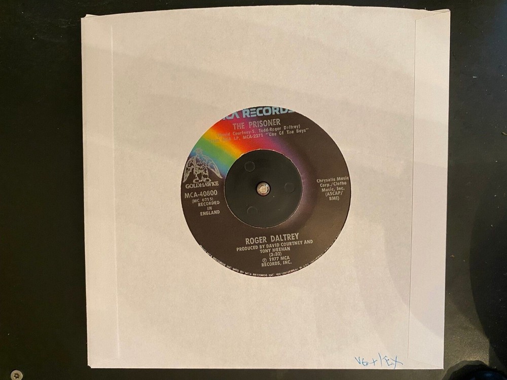 Roger Daltrey - MCA Records (MCA-40800) - 45 Vinyl VG+/EX AVENGING ANNIE / THE PRISONER All 45s will be shipped in protected cardboard record mailers!! ***COMBINED SHIPPING AVAILABLE*** *******When buying multiple records, Please ask for my invoice BEFORE paying, so I can make the adjustment for shipping and/or other discounts. If the Ebay feature isn't available (which happens occasionally) and you have to check out and pay for multiple shipping fees, I will ALWAYS refund the additional fees that they charged. Two-Five records will always be $4 combined shipping******* All records have been visually graded and played. With the long-term storage of the records, please allow for possible imperfections of label (bubbling), or vinyl (paper scuffs). Every record has gone through a professional ultrasonic cleaning bath, vacuumed, and placed in a brand new acid-free, white paper sleeve. Thanks for looking!! Additional Info... about my 45rpm vinyl record auctions.... Just inherited approximately 3000 - 7" 45rpms from the 70s, 80s, and 90s, and new listings will happen over the next few months. There will be something for everyone, including Christmas, Pop, Rock, Country, Big Band, Folk, R&B, and more! All 45s were stored in older paper sleeves, within record boxes, from previous owner. Some 45s were found inside crumpled or torn sleeves, and have been graded accordingly. Since acquiring, each 45 vinyl has been ultrasonically cleaned, vacuumed, played, graded, and photographed...then placed into a brand new acid-free paper sleeve. All auctions are priced and described to the best of my knowledge. I play all records on vintage equipment, and with a sensitive stylus. At minimal, I play the intro, and over any slight marks or scuffs (both sides) that may affect the sound quality. Grading applies to vinyl only. Any grade VG+ or above should play/sound flawless, within the music . Some very slight popping could possibly be heard upon blank intro, but should be absent when the audio begins. I'm a collector, and play all of my vinyl. I understand the audio value of a "clean" playing record! Keep in mind, these 45s have been stored for over 30 years, from a previous owner. Audio should sound pleasing, and without any clicks or pops....even though they may have possible paper sleeve scuffs, or slight marks from handling/storage. Some of the labels may have a "bubble effect, or bubbling" from damp long-term storage. Please feel free to contact me if you have any issues or problems, with your purchase. I want my buyers to be happy with their purchase, and will do what I can to help make that happen. Lastly, many of the 45's will include "juke box" labels, but not all. Only auctions that have a photo of the label, will be included in that specific record auction. Thanks for spending your time reading all of this. I totally appreciate my customers, and try to keep everything up front, in order to deliver the best customer experience. Cheers to vinyl, and the analog sound that it provides!!