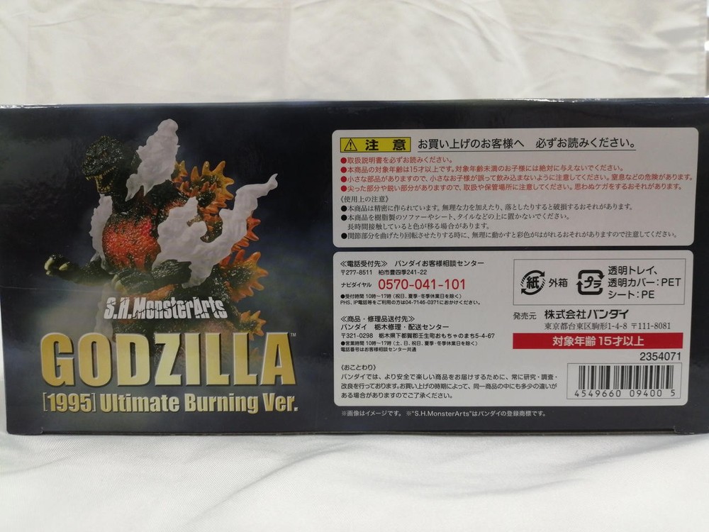 Item Title Bandai Ultimate Burning Ver. S.H.Monsterarts Godzilla 1995 Payment Supports managed payments Please pay within 5 days after auction is finished. About Us We are located in Japan. It's our pleasure to make you happy by proposing our recommend item. If you have any questions or request about items, please feel free to ask us. International Buyers - Please Note: -Import duties, taxes, and charges are not included in the item price or shipping charges. These charges are the buyer's responsibility. -Please check with your country's customs office to determine what these additional costs will be prior to bidding/buying. -These charges are normally collected by the delivering freight (shipping) company or when you pick the item up - do not confuse them for additional shipping charges. -We do not mark merchandise values below value or mark items as - gifts - The US and International government regulations prohibit such behavior. Thank you for your understanding.