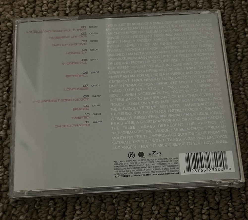 Annie Lennox's album "Bare" is a compelling addition to any music lover's collection. Produced by Steve Lipson, this CD showcases Lennox's unique vocal talent in the genres of Rock and Rock & Pop. With a run time of 49 minutes, the album features a compelling mix of musical styles, including several that are sure to appeal to fans of musicals. Released in 2003 by J Records, "Bare" is an excellent example of Lennox's artistry and creative vision. The CD is graded as Very Good (VG), indicating that it is in excellent shape and will provide a high-quality audio experience. If you're a fan of Annie Lennox or simply looking for a great addition to your music collection, "Bare" is an excellent choice.