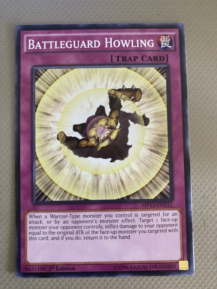 Battleguard Howling - MP15-EN111 - Common - 1st Edition Image is a stock photo of the card. You will receive the card in Heavily Played condition Condition: Heavily Played ATK/DEF : Ability : Attack #1 : Attack #2 : Attack #3 : Attribute : Trap Card Number : MP15-EN111 Card Rules : Card Text : When a Warrior-Type monster you control is targeted for an attack, or by an opponent's monster effect: Target 1 face-up monster your opponent controls; inflict damage to your opponent equal to the original ATK of the face-up monster you targeted with this card, and if you do, return it to the hand. Card Type : Normal Trap Card Edition : 1st Finish : HP : Illustrator : Level : Manufacturer : Monster Type : Name : Battleguard Howling Passcode : 78621186 Pendulum Scale : Rarity : Common Resistance : Retreat Cost : Set : 2018 Mega Tin Pack Stage : Weakness : Be sure to visit our store for a wide selection of your favorite cards! We are running specials RIGHT NOW!! Shipping Options: ~Ships in a regular white envelope with a stamp for only 30 cents! (THERE IS NO TRACKING INFORMATION AVAILABLE FOR THE ABOVE METHOD. SHIPPING TIME IS 4-10 BUSINESS DAYS) ~Shipments are handled same or next business day. ~ FREE SHIPPING for each additional card, so shop around our store!