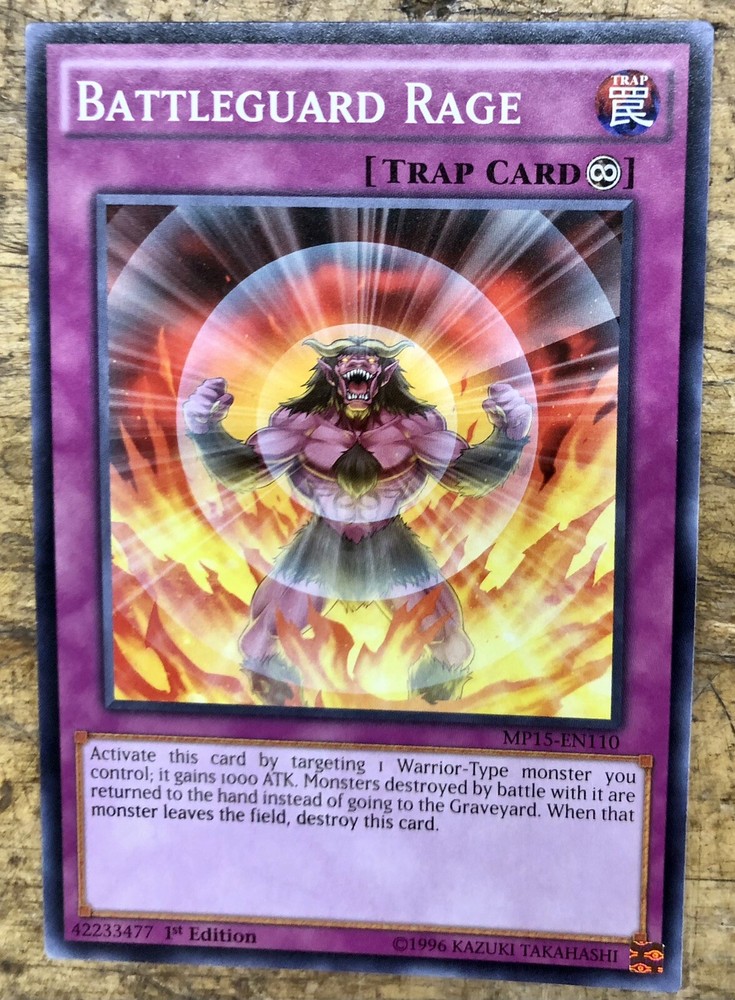 This is a rare Battleguard Rage card from the Yu-Gi-Oh! game. It is a Common card and comes from the 2015 Mega-Tin Mega Pack. The card features the MP15-EN110 card number and is in 1st Edition. This collectible card is a must-have for any Yu-Gi-Oh! fan or collector.