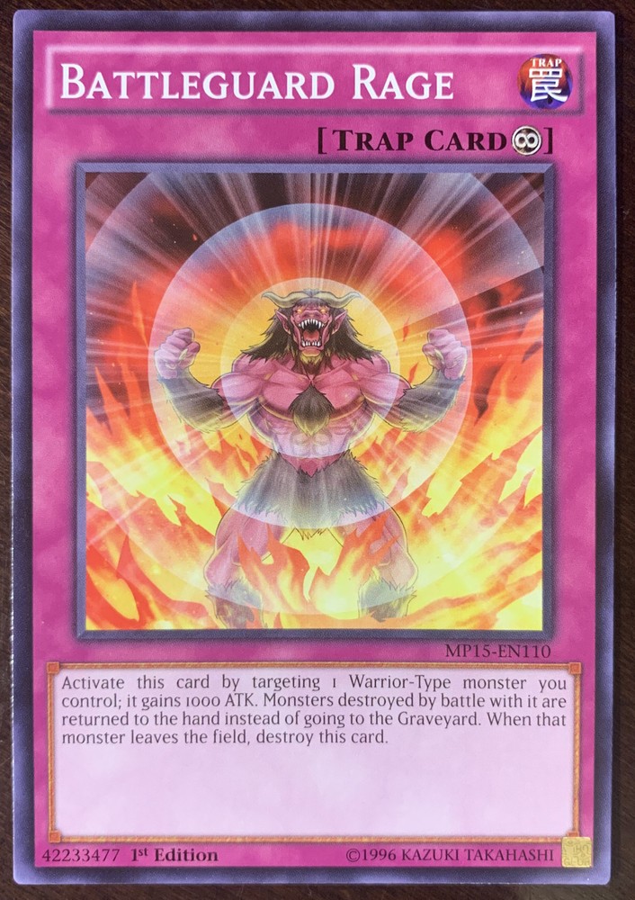 Just got this Battleguard Rage card and it’s in perfect condition—exactly as described! The seller shipped it carefully in a protective sleeve, and it arrived fast. Great for collectors or players looking for a mint-condition trap card. The eBay envelope tracking was a nice touch. Highly recommend this seller for Yugioh cards!