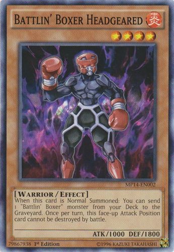 Battlin' Boxer Headgeared - MP14-EN002 - Common - 1st Edition Image is a stock photo of the card. You will receive the card in Heavily Played condition Condition: Heavily Played ATK/DEF : 1000/1800 Attribute : Fire Card Number : MP14-EN002 Card Rules : Card Text : When this card is Normal Summoned: You can send 1 "Battlin' Boxer" monster from your Deck to the Graveyard. Once per turn, this face-up Attack Position card cannot be destroyed by battle. Card Type : Effect Monster Edition : 1st Level : 4 Monster Type : Warrior Name : Battlin' Boxer Headgeared Passcode : 79867938 Pendulum Scale : Rarity : Common Set : Mega Pack 2014 Be sure to visit our store for a wide selection of your favorite cards! We are running specials RIGHT NOW!! Shipping Options: ~Ships in a regular white envelope with a stamp for FREE! (THERE IS NO TRACKING INFORMATION AVAILABLE FOR THE ABOVE METHOD. SHIPPING TIME IS 4-10 BUSINESS DAYS) ~Ships in a TRACKEDbubble mailer for $5.99! ~Shipments are handled same or next business day. ~FREE SHIPPING for each additional card, so shop around our store!