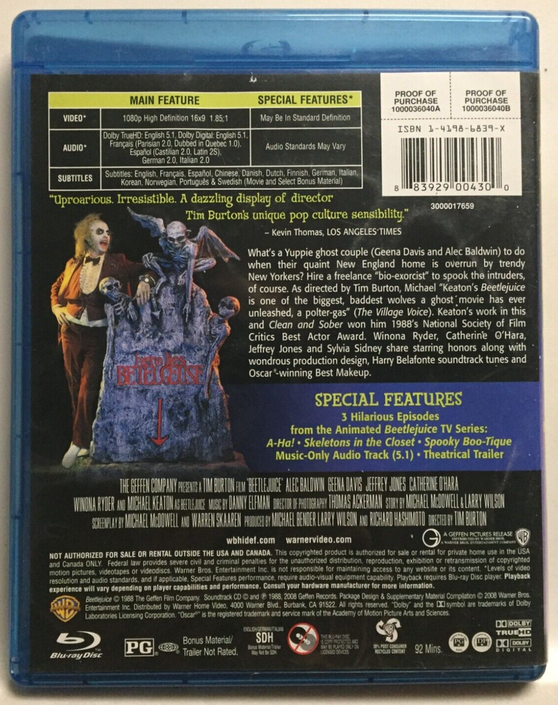 WANT IT A LOT CHEAPER?? HUGE SAVINGS!! If you are interested in Purchasing more than one of my over 5,000 Movies & CDs, SIMPLE!! Just Send Me a Message with the Items you Select and I will Make you a Wonderful Bundle Deal that you will probably not Pass Up, The More Items you Select the Bigger Deal you will Receive !! Beetlejuice [1988] (Blu-ray,2008,20th Anniversary,Deluxe Edition) Michael Keaton, Geena Davis, Catherine O'Hara, Winona Ryder, Alec Baldwin, Annie McEnroe, Jeffrey Jones, Robert Goulet, Dick Cavett, Susan Kellermann, Tony Cox Not a Scratch on Disc, Case Lightly Worn, Look at Photos!! All My Items are 100% Guaranteed to Play Perfectly or your Money Back!! PLEASE VIEW PICTURES!! THEY SPEAK A THOUSAND WORDS!! ASK QUESTIONS BEFORE PURCHASING!! Optional USPS Ground Advantage Postal Upgrade only $3.99!! (The USPS did away with First Class Package Service, This is what Replaced it) NOTE: The USPS has been having delays nationwide and have impacted delivery times on some orders 90% of all orders have no delays and arrive before the estimated delivery date The FREE SHIPPING expected delivery with tracking is normally 3-8 business days but IF delayed by USPS, orders may take much longer I ship all orders no later than the next business day after they are received Unfortunately, once shipped the delivery date is out of my control since I am no longer in possession of item PLEASE CONSIDER POSSIBLE USPS DELAYS BEFORE PURCHASING!!! I wanted to make all prospective buyers aware before ordering, that once I ship your item through USPS that I cannot do anything else to speed your package up! BUY A FEW,SAVE BIG! Promotions!! (Have to click on the promotion at the bottom of the page and has to be shipped to same address) SAVE $8 for every 4 items you Purchase OR SAVE $ 15 for every 7 Items you Purchase Have a Great Day!! Please check the pictures of the actual item for quality If Offered, There is no Guarantee that Digital copy code is not expired, used or even included What is pictured is what you get, Please ask questions if you need more information Don't be fooled by all the other listings with Stock Photos, Know what you are buying!! Increase your Savings by purchasing More than One Item!!! I regularly have Promotional Offers that include a Substantial Discount for Purchasing more than one of my already heavily discounted Items. You will see these Promotional Offers at the top of most every one of my listings. All you have to do is click on the Promotional Offer and pick the additional Items you would like to capitalize on the great discounts described in the offer Save Money on Shipping!! If you're like me and you want your item shipped quicker than Media Mail, I have heavily discounted the quicker Shipping Methods for you on most Items!! So go ahead and get your Item SUPERFAST and save a load of CA$H as well!!