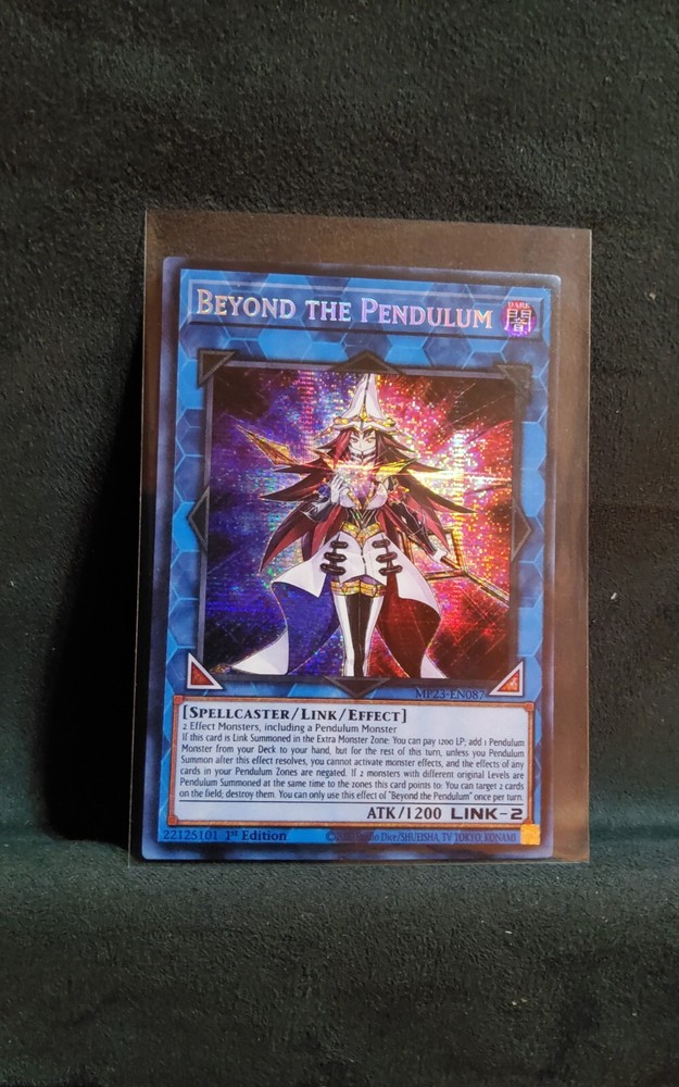 Dive into the world of high-stakes duels with the "Beyond the Pendulum" card, a powerful addition to any Yu-Gi-Oh! TCG arsenal. From the 25th Anniversary Tin: Dueling Heroes Mega Pack, this card boasts the impressive Prismatic Secret Rare rarity, ensuring it stands out in your collection. Its dark attribute gives it a formidable edge, while the spellcaster creature type hints at its mystical prowess. Card number MP23-EN087 features an attack power of 1200, ready to tip the scales in your favor. As an effect and link card type, it offers versatile gameplay options. Proudly manufactured by Konami and presented in English, this 1st edition card is a must-have for both seasoned players and collectors alike.