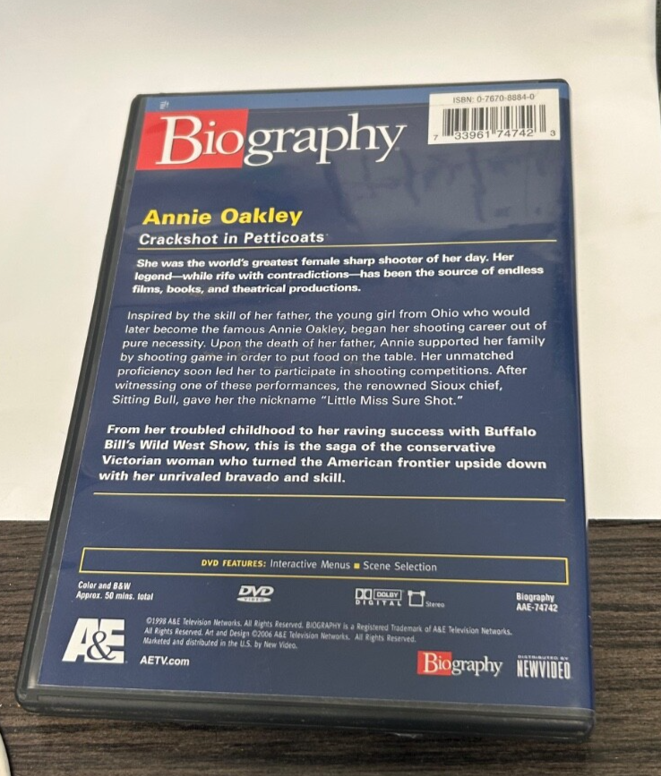 Annie Oakley crackshot in petticoats A & E's biography series. Dvd in good shape. 1998. See pictures for best description. Buyer pays $5.00 media mail.