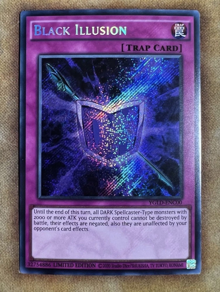 The product is a limited edition Yu-Gi-Oh! TCG card from the set "King of Games: Yugi's Legendary Decks". Specifically, it is the Black Illusion YGLD-ENC00 card, classified as a Trap-Normal card in English language. This rare and collectible card, manufactured by Konami, is a secret rare with a unique artwork and gameplay mechanics tailored for competitive gameplay. Perfect for collectors and players alike, this King of Games card is a must-have for any Yu-Gi-Oh! enthusiast looking to enhance their deck with a powerful and sought-after card.