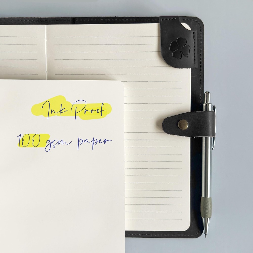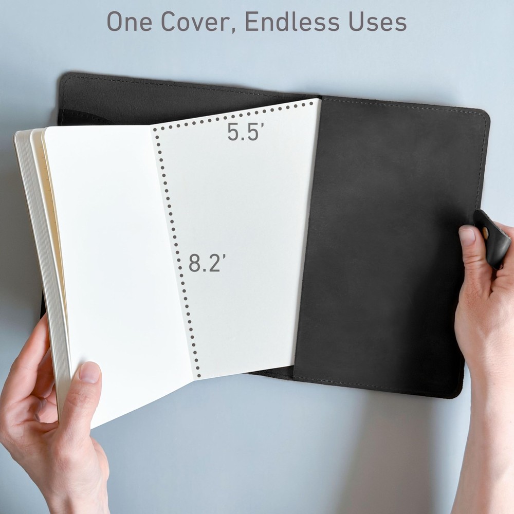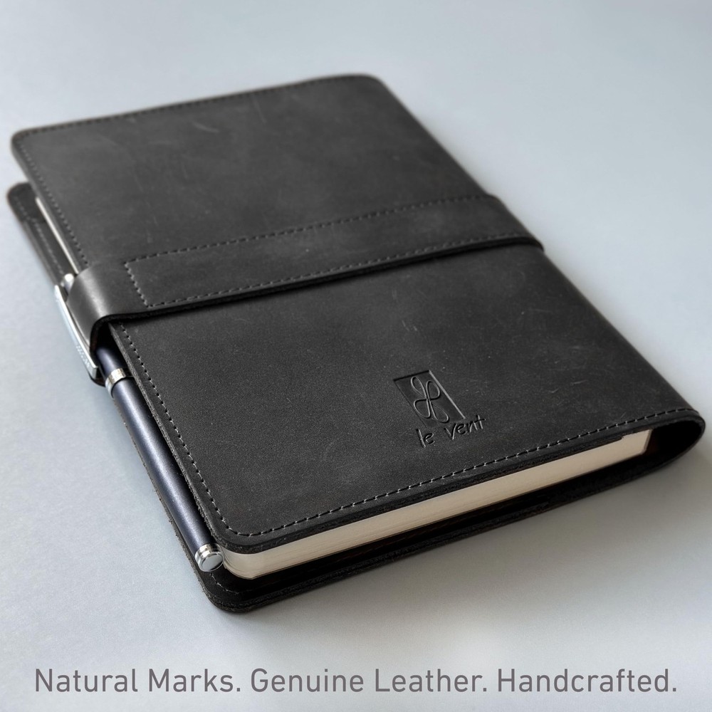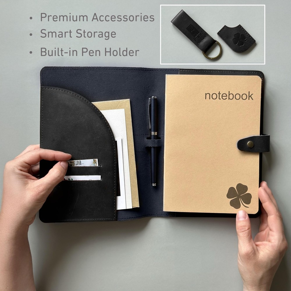 Black Leather Journal for Men and Women - Elegant Leather Notebook with 2 Lined and Blank Bound Notebooks A5 - 200 Lay Flat Pages Writing Journal and Diary for Writers and Business ELEGANT DESIGN - Our black leather journal has an elegant and minimalistic look that suits all active men and women. Leather quality and kraft paper make writing a joyful experience! Organize your notes and ideas with our stylish leather bound journal. DURABLE & LONG-LASTING - This journal for writing by is handcrafted using natural oil and hot-pressed to be sturdy, ensuring it can be used for years to come. Our refillable journal is loved for its durable leather, perfect size, and thick, lay-flat notebook pages that don't bleed through. Write, plan, and create ideas with our beautiful black journal. MULTIFUNCTIONAL - Our refillable leather notebook is multifunctional and can be used as a journal for travel, drawing, poetry, business, sketching, or as a leather planner. It includes a pen holder, an inner pocket for pads and card slots, and can replace most standard paperback 5x8 inserts. A clasp padfolio is included to effectively hold your inserts. The leather notebook cover is 8.6'x6.2'x0.7', and the A5 notebooks are 8.2'x5.5'. BONUS ITEMS - Discover the box inside the journal that includes lined and blank notebooks with 200 pages each (80 gsm paper), a leather bookmark, and a leather key ring as our bonus to you. CUSTOMER SUPPORT - If you have any questions or concerns, please contact us, and we will do our best to assist you. If your journal is missing a leather bookmark or key ring, please let us know.