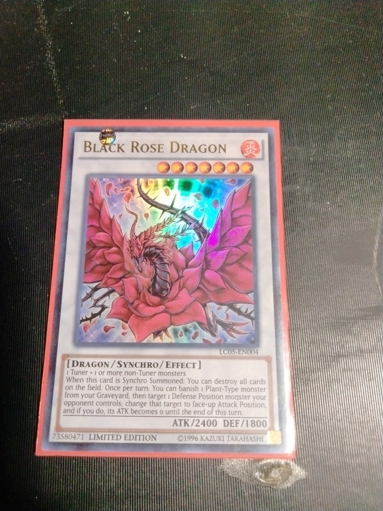 Dive into the world of Yu-Gi-Oh! TCG with the formidable Black Rose Dragon, a Limited Edition card from the Legendary Collection 5D's set. As a Synchro card with Effect capabilities, it's a must-have for any duelist looking to harness the fiery power of this Fire attribute Dragon. With an attack prowess of 2400 and a defense strength of 1800, it's a force to be reckoned with on the battlefield. Card Number LC05-EN004, the Black Rose Dragon comes in English and boasts an impressive rarity level of Ultra Rare. When summoned, you can clear the field of all cards, setting the stage for a relentless assault. Additionally, its unique ability to remove a Plant-Type monster from your Graveyard and switch an opponent's Defense Position monster to Attack Position, while reducing its ATK to 0 until the End Phase, is a game-changing tactic that can turn the tides in your favor.