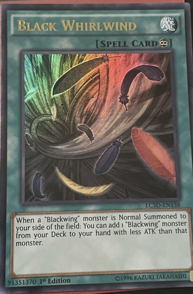 The product is a 1st Edition Ultra Rare Black Whirlwind card from the Yu-Gi-Oh! TCG's Legendary Collection 5D's set. This Spell-Normal card with a card number LC5D-EN138 features an Attack/Power of 0 and a Defense/Toughness of 0. The English language card is manufactured by Konami, making it a sought-after collectible for fans of the game.