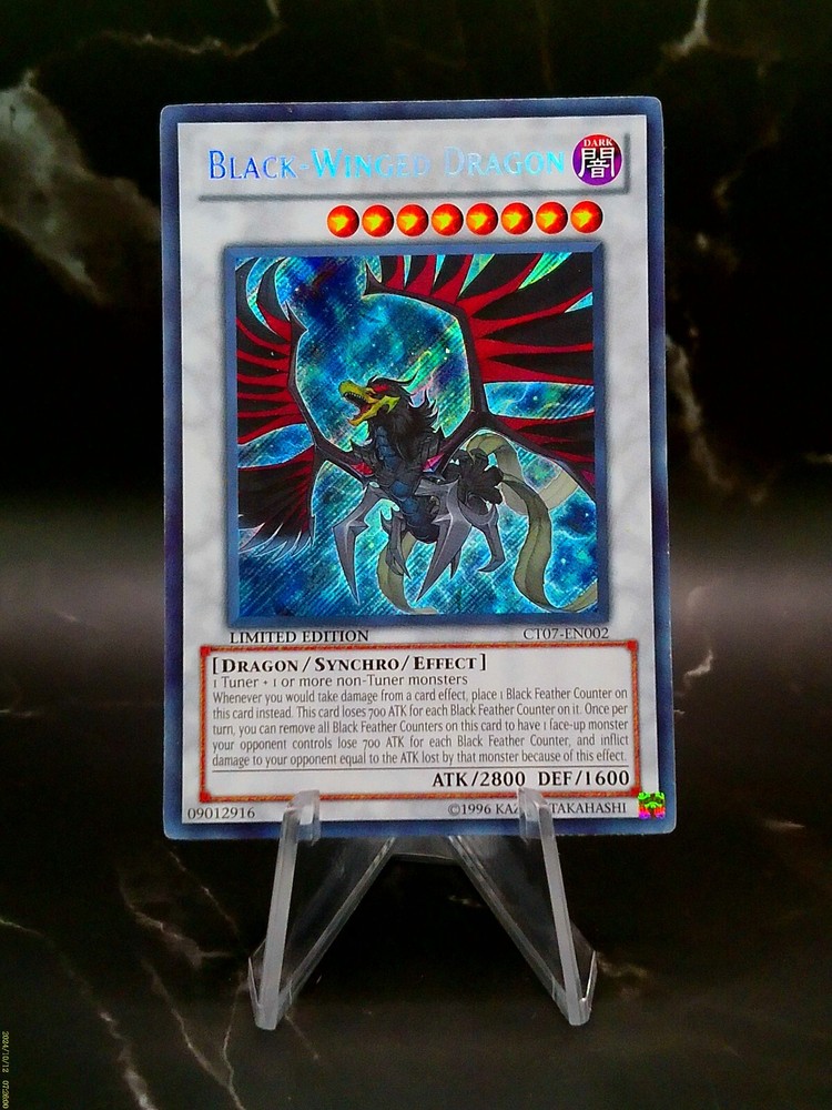 Elevate your Yu-Gi-Oh! TCG collection with the legendary Black-Winged Dragon, a Secret Rare Limited Edition card from the Collectible Tins 2010 set. Card number CT07-EN002 boasts an impressive 2800 attack power and 1600 defense toughness, ready to take on any challenger in your next duel. With its striking holographic foil finish, this card is not only a powerhouse but also a visual treat for collectors and players alike.Featuring iconic characters like Yami Yugi and Seto Kaiba, the Black-Winged Dragon card is a must-have for fans of the series. Printed in English and manufactured in the United States in 2010, it's a testament to the enduring popularity of the Yu-Gi-Oh! franchise. Perfect for players over the age of 6, this card is a timeless addition to any collection, capturing the dark essence of the beloved series.