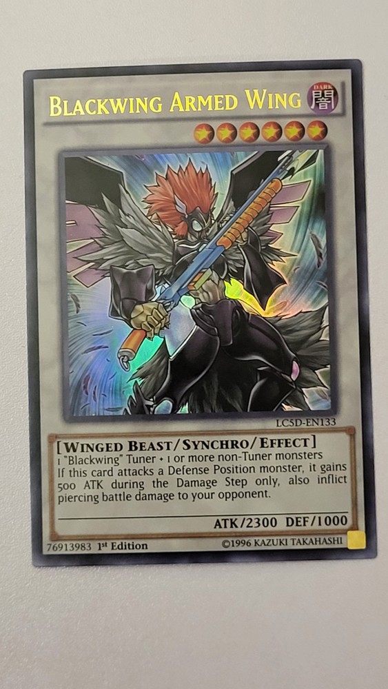 Elevate your Yu-Gi-Oh! TCG collection with the formidable Blackwing Armed Wing card from the Legendary Collection 5D's. As an Ultra Rare, 1st Edition winged beast synchro monster, it boasts an attack power of 2300 and a defense toughness of 1000, making it a pivotal addition to any deck. The card's unique ability to gain 500 ATK during the Damage Step, provided it attacks a Defense Position monster, adds a strategic edge to your gameplay. Crafted by Konami and card number LC5D-EN133, this English-language card is a must-have for both serious players and collectors. The Blackwing Armed Wing's effect card type enhances your strategic options, while its requirement of a Blackwing Tuner and at least one Non-Tuner monster fueling its effect makes it a versatile choice for various deck builds.