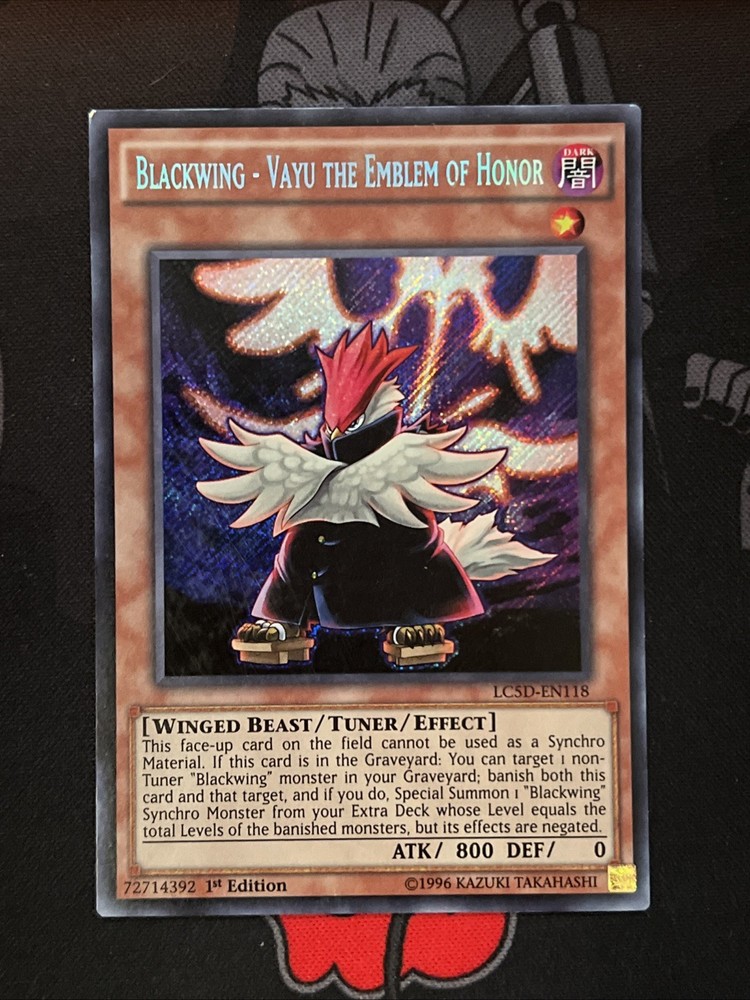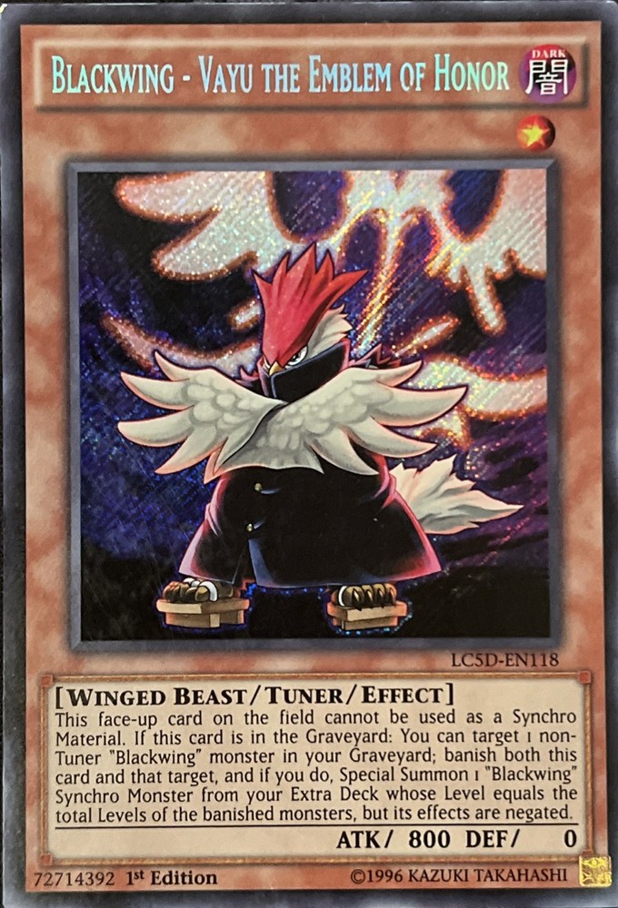 Elevate your Yu-Gi-Oh! TCG collection with the formidable Blackwing - Vayu the Emblem of Honor, from the highly regarded Legendary Collection 5D's set. Card number LC5D-EN118 features the Dark attribute and acts as a Tuner card, ideal for players looking to enhance their deck's performance. With an impressive 800 Attack/Power, this Winged Beast type card is a force to be reckoned with in the arena. This Secret Rare gem, adorned with the sought-after 1st Edition marker, is a must-have for collectors and competitive players alike. Manufactured by Konami and presented in English, it's a standout piece that boasts the distinction of being a Secret Rare card with no Defense/Toughness, symbolizing its unique and powerful presence in the game.