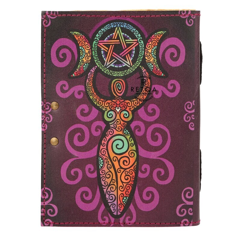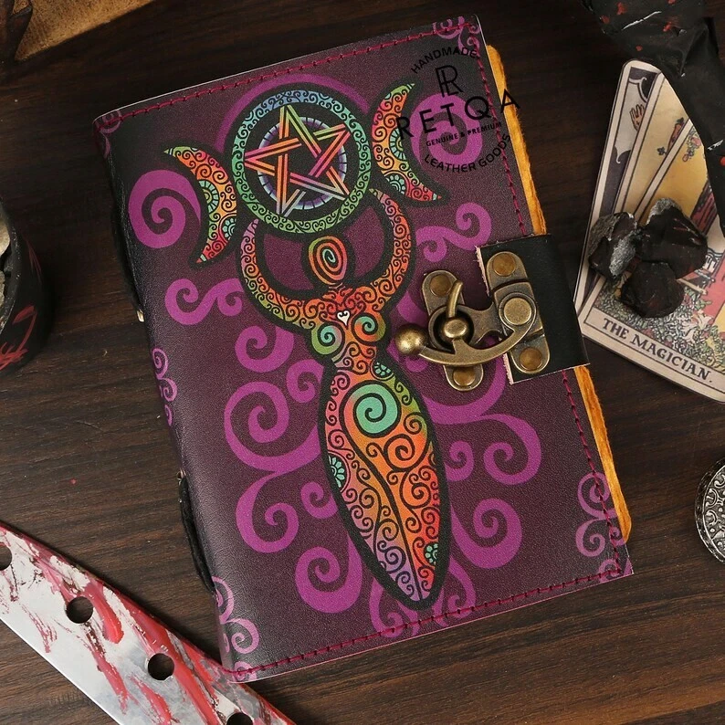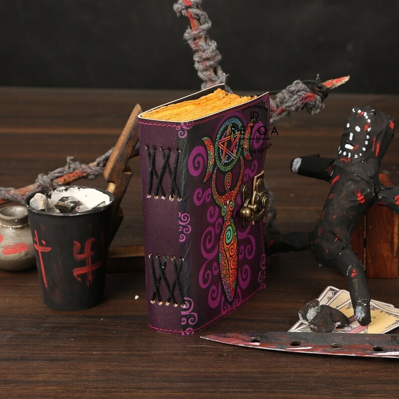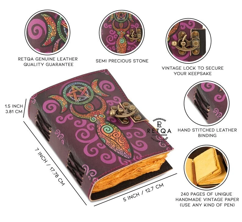 ● Handmade Leather Grimoire: This beautifully crafted Spell Book of Shadows features a vintage, genuine leather cover with an embossed Triple Moon and Pentagram design, perfect for witches, pagans, and spiritual practitioners. ● Secure Lock Clasp: The journal is equipped with a lock clasp, ensuring your personal spells, notes, and secrets are safely protected. ● Pagan & Wiccan Symbolism: Adorned with intricate embossed Pagan prayers and the powerful Pentacle symbol, this grimoire is an ideal tool for your Wiccan and witchcraft practices. ● Perfect for Rituals & Daily Use: Whether you're recording spells, rituals, or daily thoughts, the blank pages provide ample space for your writings, drawings, and personal expressions. ● Eco-Friendly & Durable: Crafted with recycled cotton paper and bound by hand, this eco-friendly grimoire is both sustainable and sturdy, perfect for long-lasting use. ● Ideal Gift for Spiritual Seekers: A thoughtful and meaningful gift for witches, pagans, Wiccans, and anyone passionate about spirituality, rituals, and magic. ● Versatile & Travel-Friendly: With its compact design, this leather notebook can easily be carried for your spiritual practices on the go, fitting comfortably in your bag or backpack.