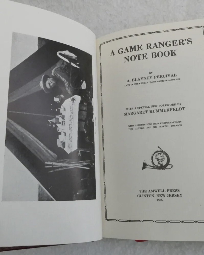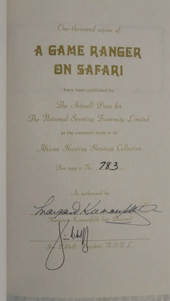 GAME RANGER NOTE BOOK SAFARI Pericval AMWELL HUNTING. A GAME RANGER ON SAFARI and A GAME RANGER'S NOTE BOOK By A. Blayney Percival The Amwell Press, Clinton, New Jersey, 1985 #783/1000 Two Leather Hardcovers in Slipcase in Near Fine Condition. This two-volume set of A GAME RANGER ON SAFARI and A GAME RANGER'S NOTE BOOK by A. Blayney Percival were published by the AMWELL PRESS in 1985. These are the fifteenth and sixteenth volume's in the National Sporting Fraternity's "AFRICAN HUNTING HERITAGE BOOK SERIES". A difficult set to find especially in this condition. Very find condition - both volumes are unread. ********************************************** The AMWELL PRESS is the publishing arm of THE NATIONAL SPORTING FRATERNITY founded in March,1976 by Jim Rikhoff. He was know and liked throughout the sport publishing industry as a result of his early founding of the Winchester Press. Because of his popularity with the industry he was able to get a who's who of international big game hunters and sport hunters as authors. The titles in the series would include original works by professional hunters, books by active sport hunters, anthologies that contained selections from both contemporary hunters and classic works and reprints of sought after titles. The titles are limited to 1000 copies or less with beautiful LEATHER binding's and SLIPCASE'S. These titles are all SIGNED by the author or editor or both and by Jim Rikhoff. In many editions you will find great PHOTOGRAPHS from the authors personal collections while in others you will find ILLUSTRATIONS from artists that capture the feel of the stories. ********************************************* A. Blayner Percival was a famous game warden in Kenya for a twenty-three year period during the first quarter of the Twentieth Century. His earlier work, A GAME RANGER'S NOTEBOOK deals with his experiences with lion, rhinoceros, buffalo and elephant in the Kenya Colony. A GAME RANGER ON SAFARI is a continuation of that work, with lots of information on safari hunting, and individual chapters on hunting Baboons, Chimpanzees, Monkeys, Oryx, Antelope, Waterbuck, Impala, Wilderbeast, Thomson's Gazelle, Jackels, Crocodile, Snakes, and more. ********************************************* Illustrated throughout with NUMEROUS photographs from the author's personal collection, as well as those of Martin Johnson. Each volume also has an attached fold-out map. ********************************** Beautiful dark RED leather, spine's lettered and pictorially decorated in gilt with the picture of a elephant and leopard, covers double-gilt-ruled, in a two-compartment, divided, BLACK slipcase ********************************************* THE BOOK'S AND SLIPCASE ARE IN VERY FINE CONDITION. ********************************* LIMITED EDITION OF #958 out of 1000 COPIES, SIGNED BY MARGARET KUMMERFELDT (PERCIVAL), (AUTHOR'S DAUGHTER) AND JIM RIKHOFF (THE PRESIDENT OF THE NATIONAL SPORTING FRATERNITY). THERE ARE TWO NEAT PREVIOUS OWNER'S BOOK PLATES TIPPED IN. ********************************* -679 total pages. -forward by Margaret Kummerfeldt, daughter of the author. -type for this volume was set by the Kingsport Press, Kingsport, Tennessee. -printed on acid-free paper, and Smythe-sewn and custom bound by the Kingsport Press, Kingsport, Tennessee. -designed by Monica Sullivan. ******************************* A GAME RANGER ON SAFARI and A GAME RANGER'S NOTE BOOK recall observations made during nearly 30 years in Africa, of which 22 were spent in the Game Department of Kenya Colony. His chapters on lions and elephants are exceptional. In 1924 he claimed that he could smell giraffes 300 yards downwind, a fact now supported by scientist at California's Humboldt State University. A reprint of two great classics of African hunting, first published in 1924 and 1928