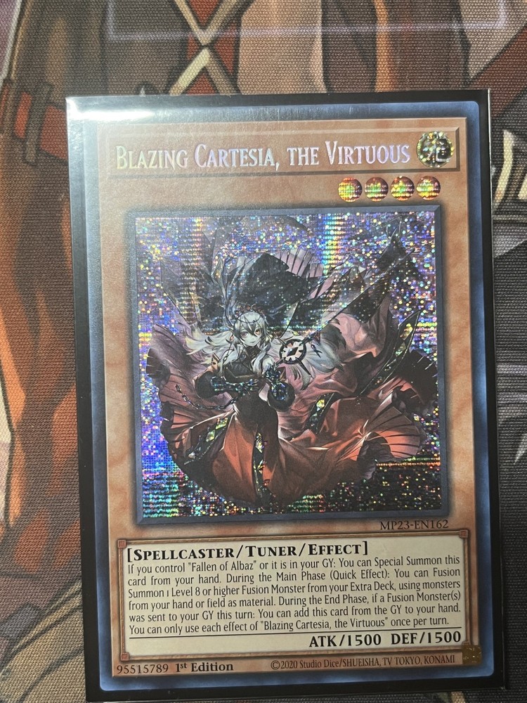 | Card Text | If you control "Fallen of Albaz" or it is in your GY: You can Special Summon this card from your hand. During the Main Phase (Quick Effect): You can Fusion Summon 1 Level 8 or higher Fusion Monster from your Extra Deck, using monsters from your hand or field as material. During the End Phase, if a Fusion Monster(s) was sent to your GY this turn: You can add this card from the GY to your hand. You can only use each effect of "Blazing Cartesia, the Virtuous" once per turn. |