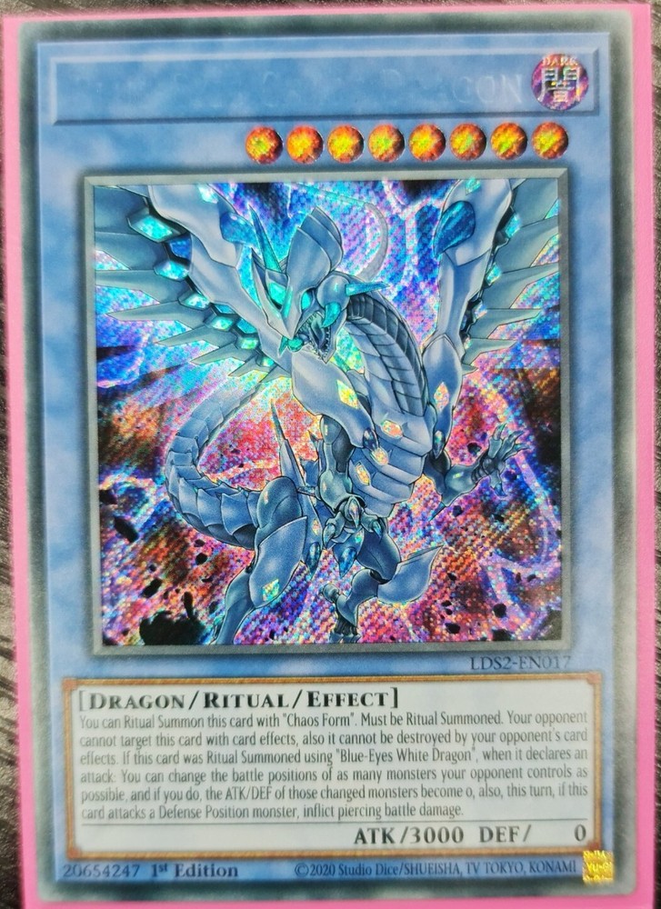 Blue Eyes Chaos Dragon - LDS2-EN017 MISPRINT (No Title) SECRET RARE - Yu-Gi-Oh! Card! This Card was pulled straight from a pack into a protective sleeve & Top loader. I Have listed Royal Mail as delivery However depending on the final sale value i Will find the absolute best way to transport this card safely. WIll be shipped in a protective plastic top loader and shipped in a protective bubble wrap envelope. Please feel free to ask any questions. Item Listed for £500 based on a similar Listing but willing to listen to serious offers.