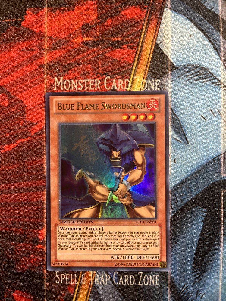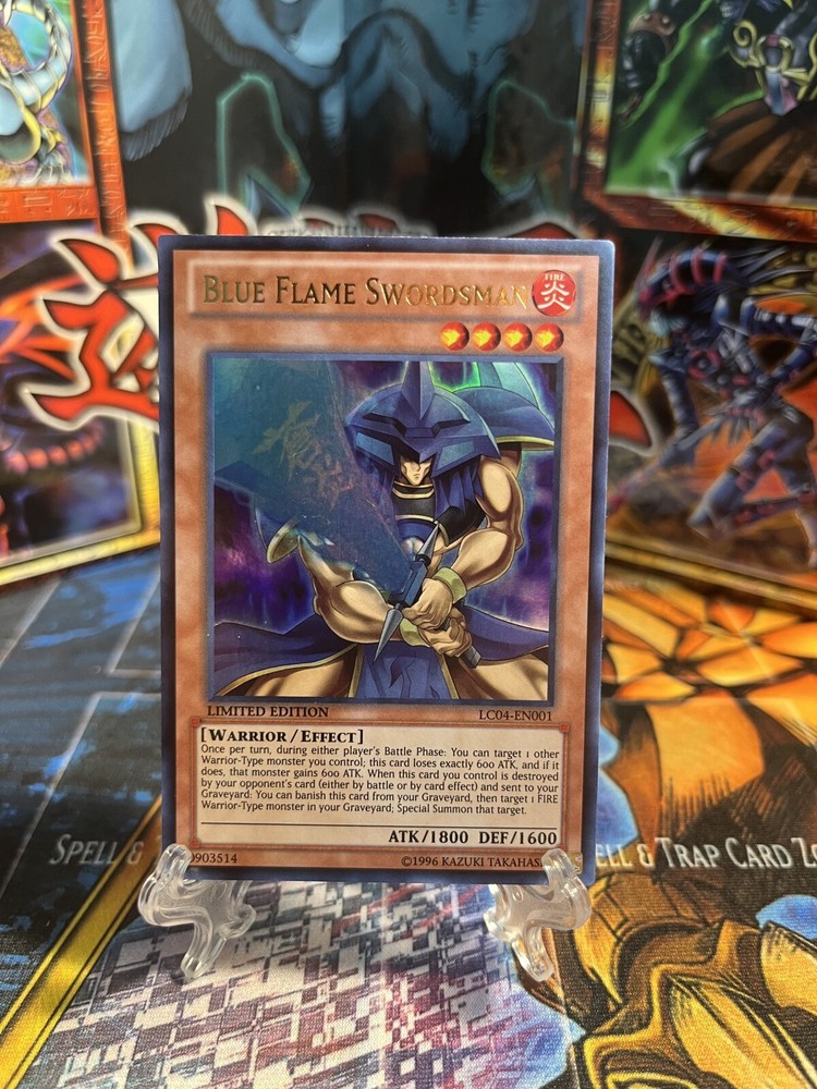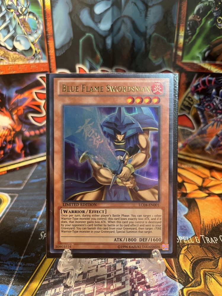 This limited edition Blue Flame Swordsman card from the Yu-Gi-Oh! TCG is a must-have for any collector. With its stunning design and powerful attributes, this card is sure to impress. The card is part of the Legendary Collection 4: Joey's World set and features the effect type, warrior creature/monster type, and a defense/toughness of 1600. The card's rarity is ultra rare and it has the card number LC04-EN001. Its attack/power is 1800 and it belongs to the fire attribute/color. This card is perfect for anyone looking to add a rare and valuable item to their collection.