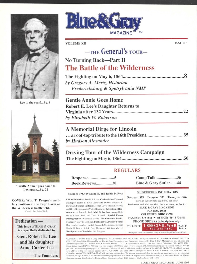 Blue & Gray Magazine Volume 12 Number 5 June 1995 Cover: Wm. T. Pogue's artillery position at the Tapp Farm on the Wilderness Battlefield Contents: The General's Tour No Turning Back - Part II: The Battle Of The Wilderness The Fighting on May 6, 1864 Gentle Annie Goes Home Robert E. Lee's daughter returns to Virginia after 132 years... A Memorial Dirge for Lincoln A roof-top tribute to the 16th President Driving Tour of the Wilderness Campaign The Fighting on May 6, 1864 Shop Historylives / Modeldetailer For Civil War Times, North & South, Blue & Gray, America's Civil War Magazines plus other items of interest.....You always save with combined shipping!!