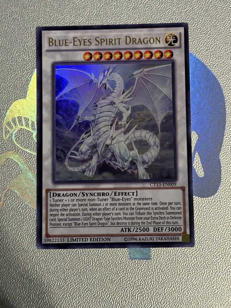 The "Blue-Eyes Spirit Dragon" card is a Limited Edition Ultra Rare card from the 2016 Mega-Tins set of the Yu-Gi-Oh! Trading Card Game. Manufactured by Konami, this Synchro and Effect card features a Dragon type monster with 2500 Attack and 3000 Defense. It is in English language and bears the card number CT13-EN009. A valuable addition to any Yu-Gi-Oh! TCG collection, this card is a highly sought-after collectible among players and collectors.